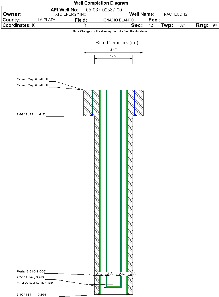 Wellbore #00 Wellbore Classification: CBM Status: PR - 9/20/2008 Measured TD: 3365 ft. Vertical TD: 3194 ft.| Wellbore Data for Original Wellbore | Wellbore Classification: CBM PR - 9/20/2008 | | Wellbore Permit | DIRECTIONAL | | Permit #: | 20083450 | Expiration Date: | 7/6/2009 | | Proposed Top PZ Location: | Sec:12 Twp: 32N 7W | Footage: 786 FSL 870 FWL | | Bottom Hole Location: | Sec:12 Twp: 32N 7W | Footage: 786 FSL 870 FWL | | Proposed Depth/Form: | 3345 ft. | | Surface Mineral Owner Same: | No | | Mineral Owner: | FEE | Surface Owner: | FEE | | Unit: | | Unit Number: | | | Formation And Spacing: | Code: FRLDC , Formation: FRUITLAND COAL , Order: 112-185 , Unit Acreage: 320, Drill Unit: S/2 |