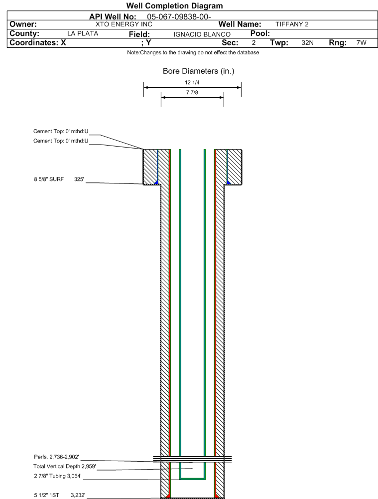 | Wellbore Completed | | Completion Date: | 11/3/2010 | | Spud Date: | 10/30/2010 | Spud Date Is: | ACTUAL | | Measured TD: | 3232 ft. | Measured PB depth: | 3181 ft. | | True Vertical TD: | 2959 ft. | True Vertical PB depth: | 2908 ft. | | Top PZ Location: | Sec:2 Twp: 32N 7W | Footage: 1913 FSL 728 FEL | | Bottom Hole Location: | Sec:2 Twp: 32N 7W | Footage: 1975 FSL 677 FEL | | Log Types: | RST/GR/CCL; CBL/GR/CCL | | Casing: | String Type: SURF, Hole Size: 12.25 in., Size: 8.625 in., Top: 0 ft., Depth: 325 ft., Weight: 24 , Citings Type: ACTUAL | | Cement: | Sacks: 215, Top: 0 ft., Bottom: 325 ft., Determination Method: VISU | | Casing: | String Type: 1ST, Hole Size: 7.875 in., Size: 5.5 in., Top: 0 ft., Depth: 3232 ft., Weight: 17 , Citings Type: ACTUAL | | Cement: | Sacks: 400, Top: 0 ft., Bottom: 3232 ft., Determination Method: CBL | | Formation | Interval Top | Log Bottom | Cored | DSTs | | OJO ALAMO | 1354 ft. | | N | N | | KIRTLAND | 1452 ft. | | N | N | | FRUITLAND | 2531 ft. | | N | N | | FRUITLAND COAL | 2734 ft. | | N | N | | PICTURED CLIFFS | 2923 ft. | | | |