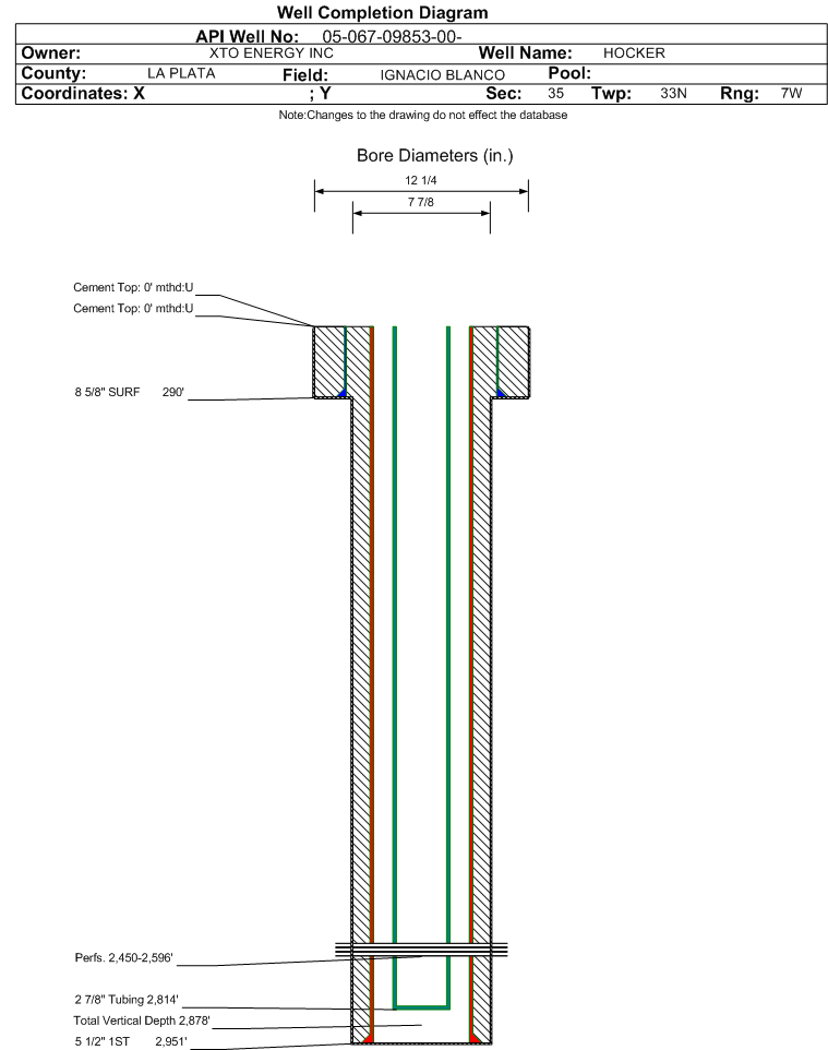 Wellbore #00 Wellbore Classification: CBM Status: PR - 5/22/2012 Measured TD: 2965 ft. Vertical TD: 2878 ft.| Wellbore Data for Original Wellbore | Wellbore Classification: CBM PR - 5/22/2012 | | Wellbore Permit | DIRECTIONAL | | Permit #: | | Expiration Date: | 5/9/2013 | | Proposed Top PZ Location: | Sec:35 Twp: 33N 7W | Footage: 707 FNL 742 FEL | | Bottom Hole Location: | Sec:35 Twp: 33N 7W | Footage: 682 FNL 694 FEL | | Proposed Depth/Form: | 2949 ft. | | Surface Mineral Owner Same: | No | | Mineral Owner: | FEE | Surface Owner: | FEE | | Unit: | | Unit Number: | | | Formation And Spacing: | Code: FRLDC , Formation: FRUITLAND COAL , Order: 112-185 , Unit Acreage: 320, Drill Unit: E/2 | | Casing: | String Type: SURF, Hole Size: 12.25 in., Size: 8.625 in., Top: 0 ft., Depth: 225 ft., Weight: 24 , Citings Type: PLANNED | | Cement: | Sacks: 134, Top: 0 ft., Bottom: 225 ft. | | Casing: | String Type: 1ST, Hole Size: 7.875 in., Size: 5.5 in., Top: 0 ft., Depth: 2949 ft., Weight: 15.5 , Citings Type: PLANNED | | Cement: | Sacks: 377, Top: 0 ft., Bottom: 2949 ft. |
