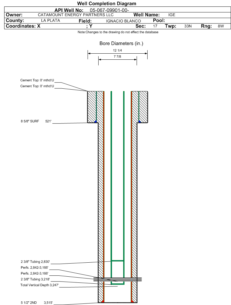 Wellbore #00 Wellbore Classification: CBM Status: PR - 8/12/2017 Measured TD: 3524 ft. Vertical TD: 3247 ft.| Wellbore Data for Original Wellbore | Wellbore Classification: CBM PR - 8/12/2017 | | Wellbore Permit | DIRECTIONAL | | Permit #: | | Expiration Date: | 1/2/2016 | | Proposed Top PZ Location: | Sec:17 Twp: 33N 8W | Footage: 1988 FNL 1643 FWL | | Bottom Hole Location: | Sec:17 Twp: 33N 8W | Footage: 2233 FNL 1813 FWL | | Proposed Depth/Form: | 3590 ft. | | Surface Mineral Owner Same: | No | | Mineral Owner: | FEE | Surface Owner: | FEE | | Unit: | | Unit Number: | | | Formation And Spacing: | Code: FRLDC , Formation: FRUITLAND COAL , Order: 112-195 , Unit Acreage: 320, Drill Unit: W/2 | | Casing: | String Type: SURF, Hole Size: 12.25 in., Size: 8.625 in., Top: 0 ft., Depth: 500 ft., Weight: 24 , Citings Type: PLANNED | | Cement: | Sacks: 400, Top: 0 ft., Bottom: 500 ft. | | Casing: | String Type: 1ST, Hole Size: 7.875 in., Size: 5.5 in., Top: 500 ft., Depth: 3590 ft., Weight: 17 , Citings Type: PLANNED | | Cement: | Sacks: 750, Top: 0 ft., Bottom: 3590 ft. |
