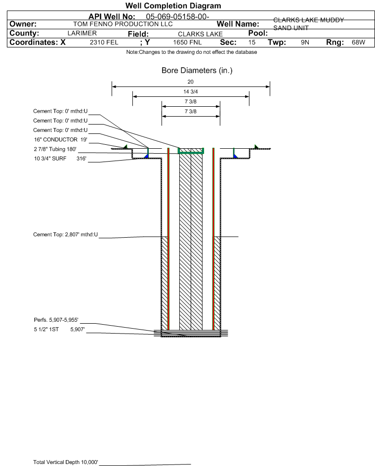 | Wellbore Completed | | Completion Date: | 8/5/1965 | | Spud Date: | 9/25/1944 | Spud Date Is: | ACTUAL | | Measured TD: | 5955 ft. | Measured PB depth: | 5730 ft. | | True Vertical TD: | 0 ft. | True Vertical PB depth: | | | Casing: | String Type: CONDUCTOR, Hole Size: , Size: 16 in., Top: , Depth: 19 ft., Weight: 57.47 , Citings Type: ACTUAL | | Cement: | Sacks: , Top: , Bottom: , Determination Method: | | Casing: | String Type: SURF, Hole Size: , Size: 10.75 in., Top: , Depth: 316 ft., Weight: 40.5 , Citings Type: ACTUAL | | Cement: | Sacks: 300, Top: 0 ft., Bottom: 316 ft., Determination Method: VISU | | Casing: | String Type: 1ST, Hole Size: 7.375 in., Size: 5.5 in., Top: , Depth: 5907 ft., Weight: 15.5 , Citings Type: ACTUAL | | Cement: | Sacks: 425, Top: 2807 ft., Bottom: 5907 ft., Determination Method: CALC | | Casing: | String Type: OPEN HOLE, Hole Size: 7.375 in., Size: , Top: , Depth: 5955 ft., Weight: , Citings Type: ACTUAL | | Cement: | Sacks: , Top: , Bottom: , Determination Method: |