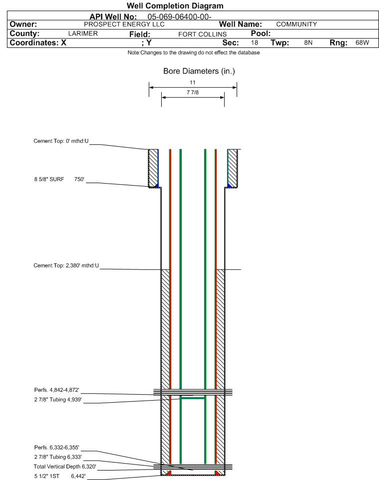 | Wellbore Completed | | Completion Date: | 6/17/2010 | | Spud Date: | 6/6/2010 | Spud Date Is: | ACTUAL | | Measured TD: | 6465 ft. | Measured PB depth: | 6398 ft. | | True Vertical TD: | 6320 ft. | True Vertical PB depth: | 6250 ft. | | Top PZ Location: | Sec:18 Twp: 8N 68W | Footage: 1417 FNL 702 FEL | | Bottom Hole Location: | Sec:18 Twp: 8N 68W | Footage: 2054 FSL 656 FEL | | Log Types: | NO NEW LOGS RUN. | | Log Types: | CBL, DEN/NEU/ACTR | | Casing: | String Type: SURF, Hole Size: 11 in., Size: 8.625 in., Top: 0 ft., Depth: 750 ft., Weight: , Citings Type: ACTUAL | | Cement: | Sacks: 255, Top: 0 ft., Bottom: 750 ft., Determination Method: | | Casing: | String Type: 1ST, Hole Size: 7.875 in., Size: 5.5 in., Top: 0 ft., Depth: 6442 ft., Weight: , Citings Type: ACTUAL | | Cement: | Sacks: 1070, Top: 2380 ft., Bottom: 6442 ft., Determination Method: CBL | | Formation | Interval Top | Log Bottom | Cored | DSTs | | HYGIENE | 1408 ft. | | | | | NIOBRARA | 3954 ft. | | | | | TIMPAS | 4286 ft. | | | | | CODELL | 4308 ft. | | | | | GREENHORN | 4391 ft. | | | | | BENTONITE | 4490 ft. | | N | N | | GRANEROS | 4600 ft. | | | | | MUDDY | 4841 ft. | | | | | DAKOTA | 5066 ft. | | | | | MORRISON | 5080 ft. | | | | | SUNDANCE | 5250 ft. | | | | | LYKINS | 5430 ft. | | N | N | | ENTRADA | 5488 ft. | | | | | LYONS | 6312 ft. | | | |