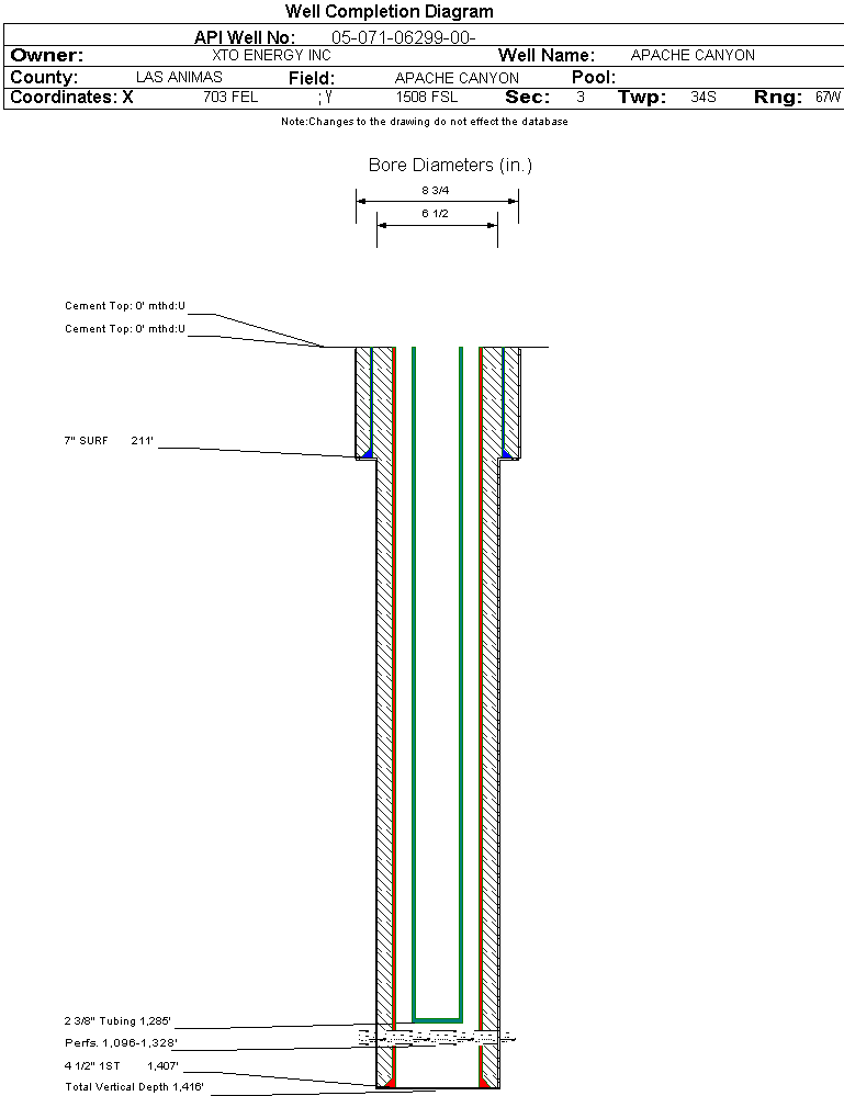 | Wellbore Completed | | Completion Date: | 2/10/1997 | | Spud Date: | 11/18/1996 | Spud Date Is: | ACTUAL | | Measured TD: | 1416 ft. | Measured PB depth: | 1378 ft. | | True Vertical TD: | | True Vertical PB depth: | | | Log Types: | DIL, CDL, CBL | | Casing: | String Type: SURF, Hole Size: 8.75 in., Size: 7 in., Top: 0 ft., Depth: 211 ft., Weight: , Citings Type: ACTUAL | | Cement: | Sacks: 65, Top: 0 ft., Bottom: , Determination Method: | | Casing: | String Type: 1ST, Hole Size: 6.5 in., Size: 4.5 in., Top: 0 ft., Depth: 1407 ft., Weight: 10.5 , Citings Type: ACTUAL | | Cement: | Sacks: 192, Top: 0 ft., Bottom: , Determination Method: | | Formation | Interval Top | Log Bottom | Cored | DSTs | | RATON COAL | 277 ft. | 378 ft. | N | N | | VERMEJO COAL | 1096 ft. | 1348 ft. | N | N |