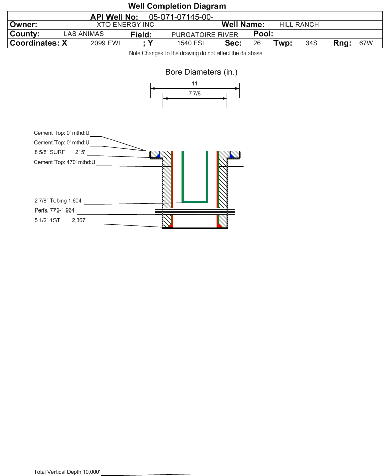 | Wellbore Completed | | Completion Date: | 2/28/2001 | | Spud Date: | 1/4/2001 | Spud Date Is: | ACTUAL | | Measured TD: | 2370 ft. | Measured PB depth: | 2349 ft. | | True Vertical TD: | | True Vertical PB depth: | | | Log Types: | INDUCTION, DENSITY, NEUTRON & CEMENT BOND LOGS (2) | | Casing: | String Type: SURF, Hole Size: 11 in., Size: 8.625 in., Top: 0 ft., Depth: 215 ft., Weight: 24 , Citings Type: ACTUAL | | Cement: | Sacks: 50, Top: 0 ft., Bottom: 215 ft., Determination Method: | | Casing: | String Type: 1ST, Hole Size: 7.875 in., Size: 5.5 in., Top: 0 ft., Depth: 2367 ft., Weight: 15.5 , Citings Type: ACTUAL | | Cement: | Sacks: 375, Top: 470 ft., Bottom: 2367 ft., Determination Method: CBL | | Casing: | String Type: S.C. 1.1, Hole Size: , Size: , Top: , Depth: 2367 ft., Weight: , Citings Type: ACTUAL | | Cement: | Sacks: 50, Top: 0 ft., Bottom: 470 ft., Determination Method: CBL | | Formation | Interval Top | Log Bottom | Cored | DSTs | | RATON COAL | 0 ft. | 1965 ft. | N | N | | VERMEJO COAL | 1965 ft. | 2275 ft. | N | N | | TRINIDAD | 2275 ft. | 2370 ft. | N | N |