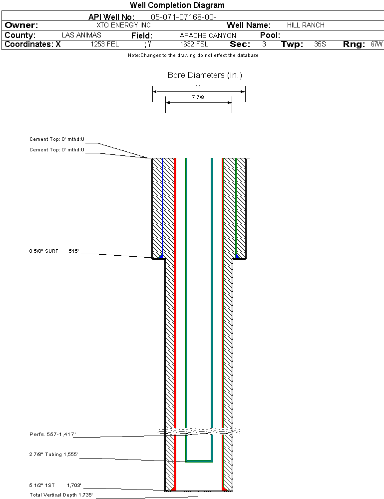 | Wellbore Completed | | Completion Date: | 10/23/2001 | | Spud Date: | 8/13/2001 | Spud Date Is: | ACTUAL | | Measured TD: | 1735 ft. | Measured PB depth: | 1621 ft. | | True Vertical TD: | | True Vertical PB depth: | | | Log Types: | COMP.DENSITY/ NEUTRON,SINGLE INDUCTION | | Casing: | String Type: SURF, Hole Size: 11 in., Size: 8.625 in., Top: 0 ft., Depth: 515 ft., Weight: 23 , Citings Type: ACTUAL | | Cement: | Sacks: 138, Top: 0 ft., Bottom: 515 ft., Determination Method: | | Casing: | String Type: 1ST, Hole Size: 7.875 in., Size: 5.5 in., Top: 0 ft., Depth: 1703 ft., Weight: 15.5 , Citings Type: ACTUAL | | Cement: | Sacks: 240, Top: 0 ft., Bottom: 1703 ft., Determination Method: CBL | | Formation | Interval Top | Log Bottom | Cored | DSTs | | RATON COAL | 400 ft. | 1635 ft. | N | N |