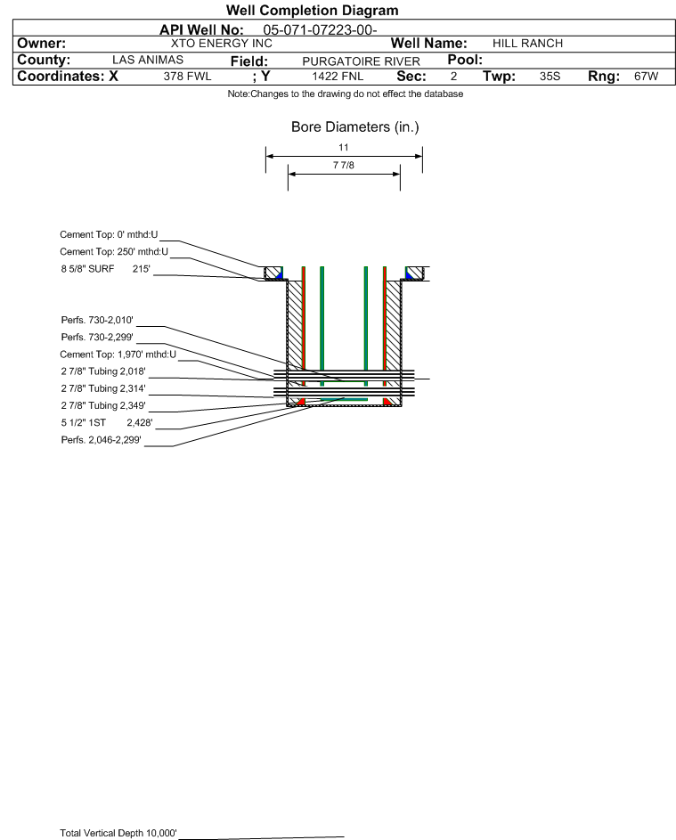 | | Perforation Data: | | Interval Top: | 730 ft. | # Of Holes: | | | Interval Bottom: | 2299 ft. | Hole Size: | |