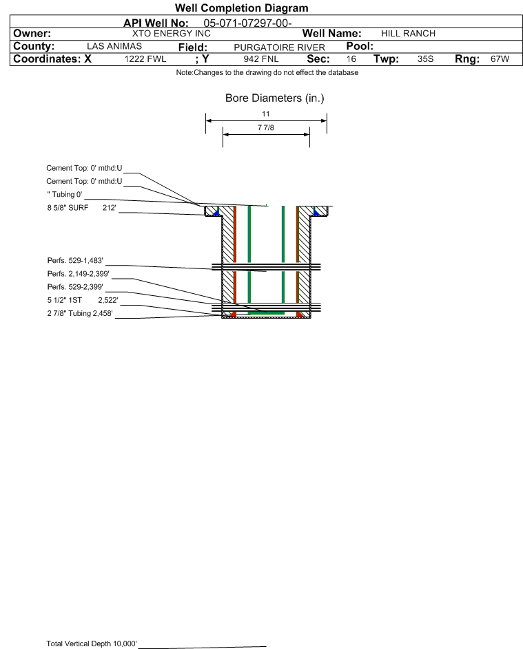 | | Perforation Data: | | Interval Top: | 529 ft. | # Of Holes: | 104 | | Interval Bottom: | 2399 ft. | Hole Size: | 0.45 in. |