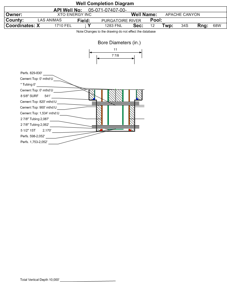 | | Perforation Data: | | Interval Top: | 598 ft. | # Of Holes: | 254 | | Interval Bottom: | 2052 ft. | Hole Size: | 0.45 in. |