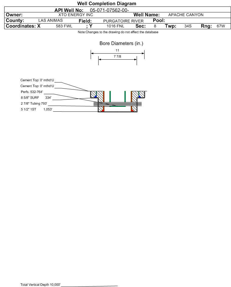 | | Perforation Data: | | Interval Top: | 532 ft. | # Of Holes: | 96 | | Interval Bottom: | 764 ft. | Hole Size: | 4 in. |