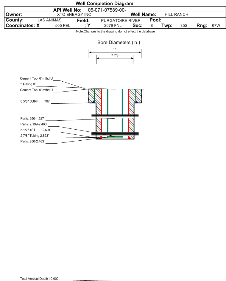 | | Perforation Data: | | Interval Top: | 950 ft. | # Of Holes: | 176 | | Interval Bottom: | 2463 ft. | Hole Size: | 0.45 in. |