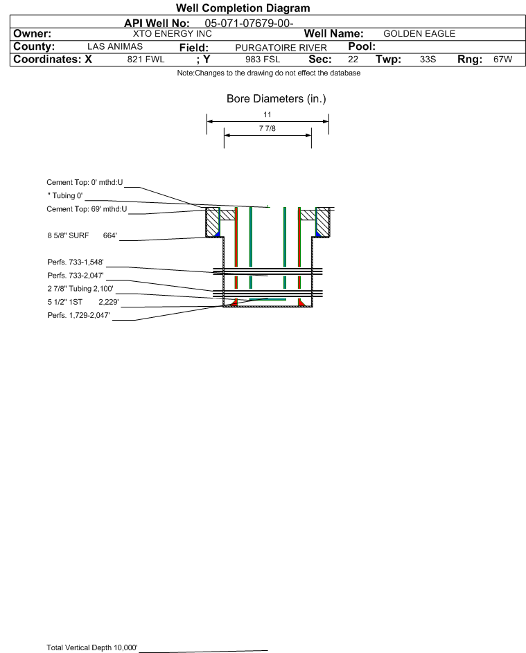| | Perforation Data: | | Interval Top: | 733 ft. | # Of Holes: | 140 | | Interval Bottom: | 2047 ft. | Hole Size: | 0.5 in. |