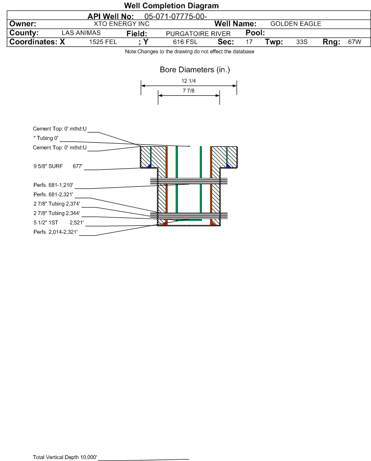 | | Perforation Data: | | Interval Top: | 2014 ft. | # Of Holes: | 102 | | Interval Bottom: | 2321 ft. | Hole Size: | 0.51 in. |