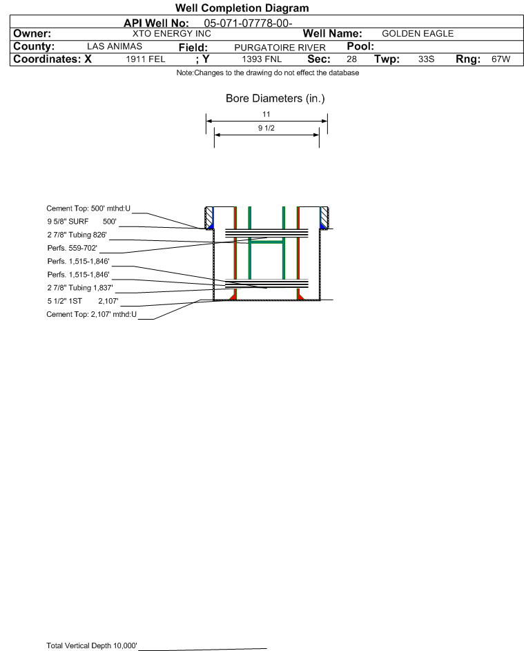 | | Perforation Data: | | Interval Top: | 559 ft. | # Of Holes: | 15 | | Interval Bottom: | 702 ft. | Hole Size: | 0.4 in. |