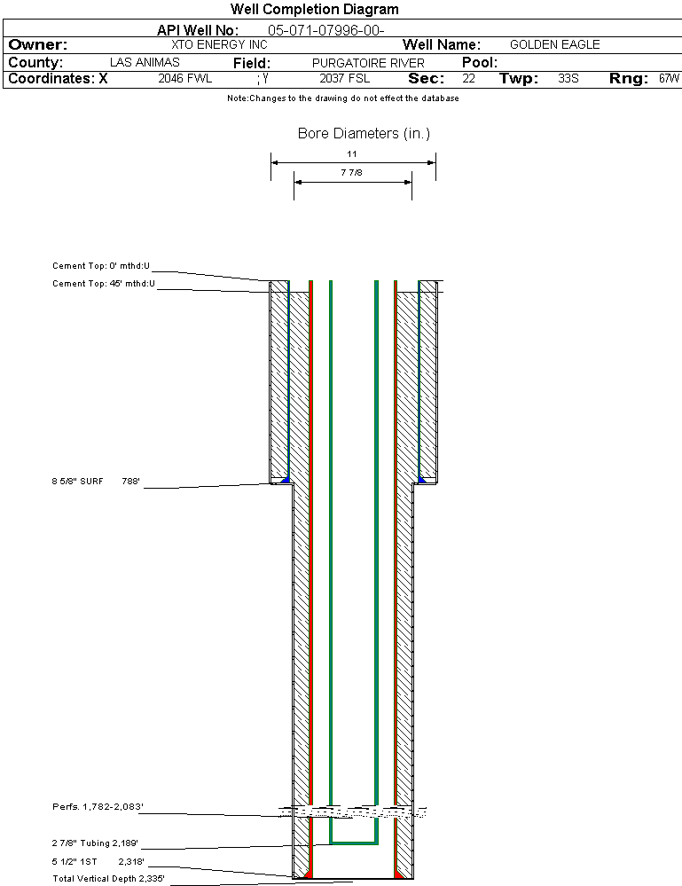 | Wellbore Completed | | Completion Date: | 6/26/2004 | | Spud Date: | 3/13/2004 | Spud Date Is: | ACTUAL | | Measured TD: | 2335 ft. | Measured PB depth: | 2282 ft. | | True Vertical TD: | | True Vertical PB depth: | | | Log Types: | AIL , TLD / CSN & GR / CBL, CALIPER-CEMENT VOLUME | | Casing: | String Type: SURF, Hole Size: 11 in., Size: 8.625 in., Top: 0 ft., Depth: 788 ft., Weight: 24 , Citings Type: ACTUAL | | Cement: | Sacks: 330, Top: 0 ft., Bottom: 766 ft., Determination Method: CALC | | Casing: | String Type: 1ST, Hole Size: 7.875 in., Size: 5.5 in., Top: 0 ft., Depth: 2318 ft., Weight: 15.5 , Citings Type: ACTUAL | | Cement: | Sacks: 364, Top: 45 ft., Bottom: 2318 ft., Determination Method: CBL | | Formation | Interval Top | Log Bottom | Cored | DSTs | | RATON COAL | 0 ft. | 1619 ft. | N | N | | VERMEJO COAL | 1712 ft. | 2114 ft. | N | N | | TRINIDAD | 2114 ft. | 2336 ft. | N | N |