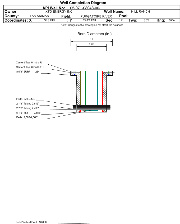 | | Perforation Data: | | Interval Top: | 579 ft. | # Of Holes: | 166 | | Interval Bottom: | 2440 ft. | Hole Size: | 0.45 in. |
