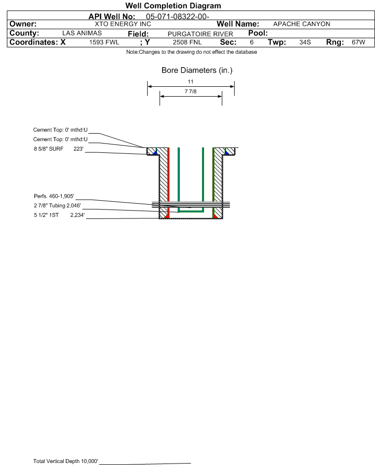 | Wellbore Completed | | Completion Date: | 6/8/2005 | | Spud Date: | 3/16/2005 | Spud Date Is: | ACTUAL | | Measured TD: | 2275 ft. | Measured PB depth: | 2184 ft. | | True Vertical TD: | | True Vertical PB depth: | | | Log Types: | AIL / GR / CAL / TLD / CNL / TEMP / CCL / CBL | | Casing: | String Type: SURF, Hole Size: 11 in., Size: 8.625 in., Top: 0 ft., Depth: 223 ft., Weight: 24 , Citings Type: ACTUAL | | Cement: | Sacks: 146, Top: 0 ft., Bottom: 223 ft., Determination Method: CALC | | Casing: | String Type: 1ST, Hole Size: 7.875 in., Size: 5.5 in., Top: 0 ft., Depth: 2234 ft., Weight: 15.5 , Citings Type: ACTUAL | | Cement: | Sacks: 370, Top: 0 ft., Bottom: 2234 ft., Determination Method: CBL | | Formation | Interval Top | Log Bottom | Cored | DSTs | | RATON COAL | 0 ft. | 1488 ft. | N | N | | VERMEJO COAL | 1634 ft. | 1976 ft. | N | N | | TRINIDAD | 1976 ft. | 2260 ft. | N | N |