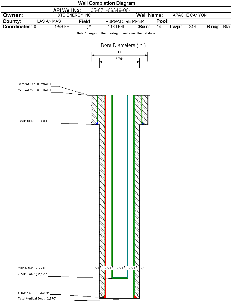 | Wellbore Completed | | Completion Date: | 6/18/2005 | | Spud Date: | 3/22/2005 | Spud Date Is: | ACTUAL | | Measured TD: | 2370 ft. | Measured PB depth: | 2297 ft. | | True Vertical TD: | | True Vertical PB depth: | | | Log Types: | GR/CCL/CBL, CNL-TLD, AIL, TEMPERATURE | | Casing: | String Type: SURF, Hole Size: 11 in., Size: 8.625 in., Top: 0 ft., Depth: 338 ft., Weight: 24 , Citings Type: ACTUAL | | Cement: | Sacks: 169, Top: 0 ft., Bottom: 338 ft., Determination Method: CALC | | Casing: | String Type: 1ST, Hole Size: 7.875 in., Size: 5.5 in., Top: 0 ft., Depth: 2345 ft., Weight: 15.5 , Citings Type: ACTUAL | | Cement: | Sacks: 400, Top: 0 ft., Bottom: 2345 ft., Determination Method: CBL | | Formation | Interval Top | Log Bottom | Cored | DSTs | | RATON COAL | 0 ft. | 1648 ft. | N | N | | VERMEJO COAL | 1755 ft. | 2052 ft. | N | N | | TRINIDAD | 2052 ft. | 2355 ft. | N | N |