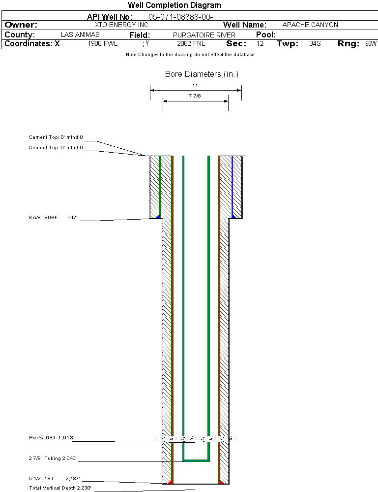 | Wellbore Completed | | Completion Date: | 6/29/2005 | | Spud Date: | 6/14/2005 | Spud Date Is: | ACTUAL | | Measured TD: | 2230 ft. | Measured PB depth: | 2143 ft. | | True Vertical TD: | | True Vertical PB depth: | | | Log Types: | AIL/TLD/CNL/TEMP/GR/CBL/CCL | | Casing: | String Type: SURF, Hole Size: 11 in., Size: 8.625 in., Top: 0 ft., Depth: 417 ft., Weight: 24 , Citings Type: ACTUAL | | Cement: | Sacks: 189, Top: 0 ft., Bottom: 417 ft., Determination Method: CALC | | Casing: | String Type: 1ST, Hole Size: 7.875 in., Size: 5.5 in., Top: 0 ft., Depth: 2187 ft., Weight: 15.5 , Citings Type: ACTUAL | | Cement: | Sacks: 170, Top: 0 ft., Bottom: 2187 ft., Determination Method: CBL | | Formation | Interval Top | Log Bottom | Cored | DSTs | | RATON COAL | 0 ft. | 1542 ft. | N | N | | VERMEJO COAL | 1589 ft. | 1962 ft. | N | N | | TRINIDAD | 1962 ft. | 2218 ft. | N | N |