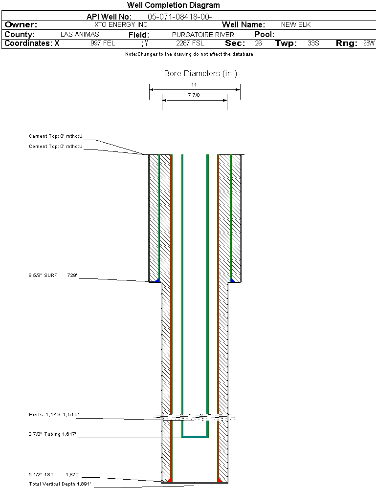 | | Perforation Data: | | Interval Top: | 1143 ft. | # Of Holes: | 55 | | Interval Bottom: | 1519 ft. | Hole Size: | 0.4 in. |