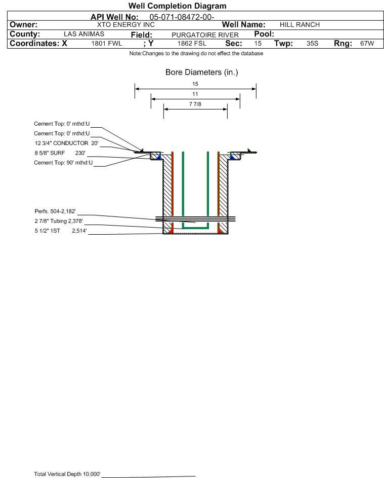 | Wellbore Completed | | Completion Date: | 11/10/2005 | | Spud Date: | 11/5/2005 | Spud Date Is: | ACTUAL | | Measured TD: | 2700 ft. | Measured PB depth: | 2460 ft. | | True Vertical TD: | | True Vertical PB depth: | | | Log Types: | TEMPERATURE, ARRAY INDUCTION TOOL GAMMA RAY, SP, TRIPLE LITHOLOGY DENSITY COMPENSATED NUETRON, CEMENT BOND LOG | | Casing: | String Type: CONDUCTOR, Hole Size: 15 in., Size: 12.75 in., Top: 0 ft., Depth: 20 ft., Weight: , Citings Type: ACTUAL | | Cement: | Sacks: 5, Top: 0 ft., Bottom: 20 ft., Determination Method: CALC | | Casing: | String Type: SURF, Hole Size: 11 in., Size: 8.625 in., Top: 0 ft., Depth: 230 ft., Weight: , Citings Type: ACTUAL | | Cement: | Sacks: 95, Top: 0 ft., Bottom: 230 ft., Determination Method: CALC | | Casing: | String Type: 1ST, Hole Size: 7.875 in., Size: 5.5 in., Top: 0 ft., Depth: 2514 ft., Weight: , Citings Type: ACTUAL | | Cement: | Sacks: 465, Top: 90 ft., Bottom: 2514 ft., Determination Method: CBL | | Formation | Interval Top | Log Bottom | Cored | DSTs | | RATON COAL | 0 ft. | 2001 ft. | N | N | | VERMEJO COAL | 2095 ft. | 2352 ft. | N | N | | TRINIDAD | 2352 ft. | | N | N |