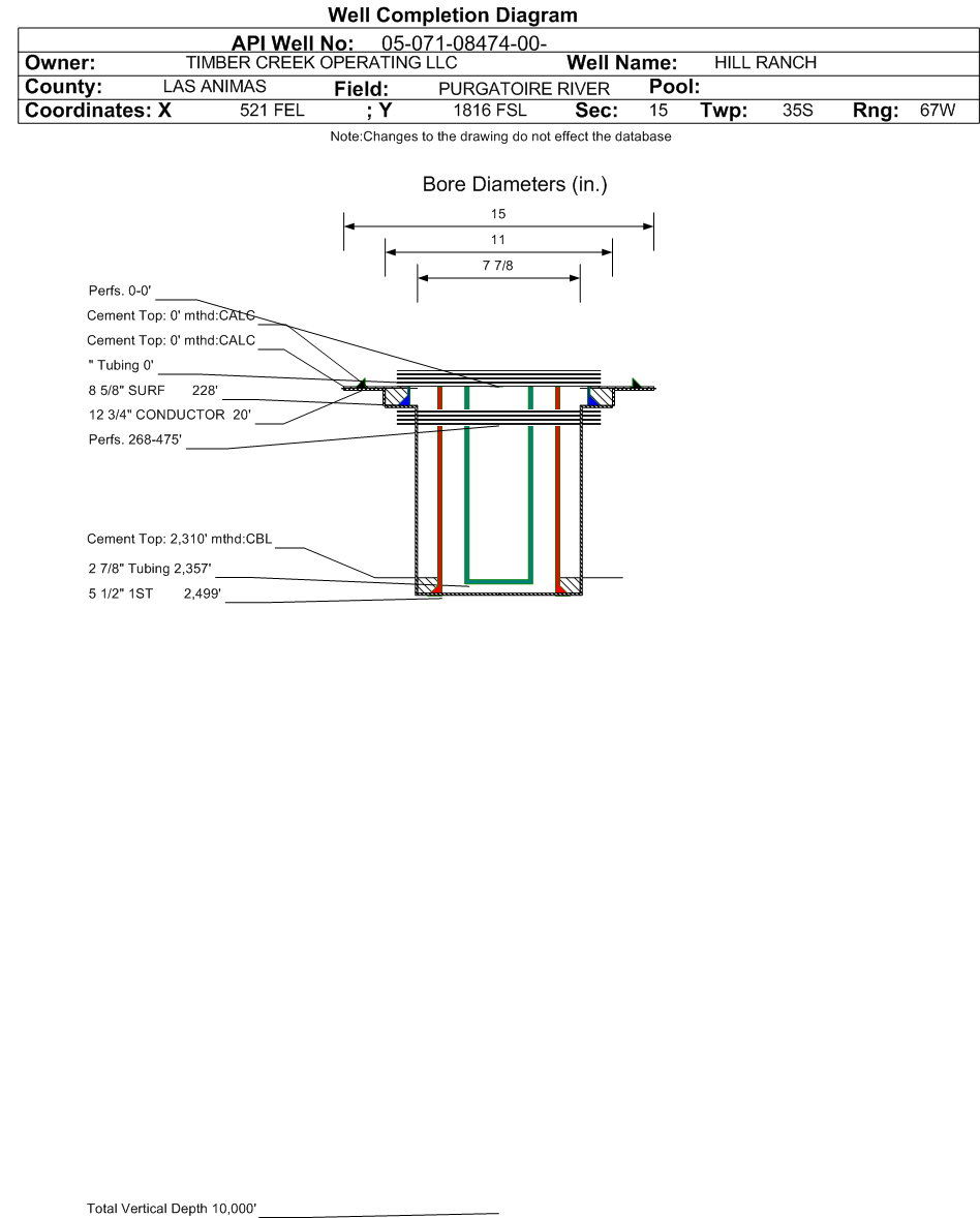 | Wellbore Completed | | Completion Date: | 4/28/2006 | | Spud Date: | 11/11/2005 | Spud Date Is: | ACTUAL | | Measured TD: | 3747 ft. | Measured PB depth: | 3615 ft. | | True Vertical TD: | | True Vertical PB depth: | | | Bottom Hole Location: | Sec:15 Twp: 35S 67W | Footage: 1069 FNL 1148 FEL | | Log Types: | | | Casing: | String Type: CONDUCTOR, Hole Size: 15 in., Size: 12.75 in., Top: 0 ft., Depth: 20 ft., Weight: 33 , Citings Type: ACTUAL | | Cement: | Sacks: 7, Top: 0 ft., Bottom: 20 ft., Determination Method: CALC | | Casing: | String Type: SURF, Hole Size: 11 in., Size: 8.625 in., Top: 0 ft., Depth: 228 ft., Weight: 24 , Citings Type: ACTUAL | | Cement: | Sacks: 120, Top: 0 ft., Bottom: 228 ft., Determination Method: CALC | | Casing: | String Type: 1ST, Hole Size: 7.875 in., Size: 5.5 in., Top: 0 ft., Depth: 2499 ft., Weight: 15.5 , Citings Type: ACTUAL | | Cement: | Sacks: 130, Top: 170 ft., Bottom: 2499 ft., Determination Method: CBL | | Casing: | String Type: 1ST LINER, Hole Size: 4.75 in., Size: 3.5 in., Top: 2125 ft., Depth: 3615 ft., Weight: 9.3 , Citings Type: ACTUAL | | Cement: | Sacks: , Top: , Bottom: , Determination Method: | | Additional Cement: | String Type: 1ST , Top: 180 ft., Depth: 2291 ft., Bottom: 1854 ft., Sacks: 84, Method: SQUEEZE | | No formation data to display. |