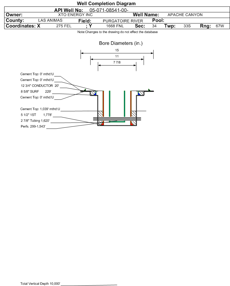 | Wellbore Completed | | Completion Date: | 11/21/2005 | | Spud Date: | 11/20/2005 | Spud Date Is: | ACTUAL | | Measured TD: | 1800 ft. | Measured PB depth: | 1730 ft. | | True Vertical TD: | | True Vertical PB depth: | | | Log Types: | TEMP,AIT/GR,CNL/TLD, CBL | | Casing: | String Type: CONDUCTOR, Hole Size: 15 in., Size: 12.75 in., Top: , Depth: 20 ft., Weight: , Citings Type: ACTUAL | | Cement: | Sacks: 7, Top: 0 ft., Bottom: 20 ft., Determination Method: CALC | | Casing: | String Type: SURF, Hole Size: 11 in., Size: 8.625 in., Top: , Depth: 229 ft., Weight: , Citings Type: ACTUAL | | Cement: | Sacks: 101, Top: 0 ft., Bottom: 229 ft., Determination Method: CALC | | Casing: | String Type: 1ST, Hole Size: 7.875 in., Size: 5.5 in., Top: , Depth: 1778 ft., Weight: , Citings Type: ACTUAL | | Cement: | Sacks: 315, Top: 1039 ft., Bottom: 1778 ft., Determination Method: CBL | | Casing: | String Type: S.C. 1.1, Hole Size: , Size: , Top: , Depth: , Weight: , Citings Type: ACTUAL | | Cement: | Sacks: , Top: , Bottom: , Determination Method: CALC | | Formation | Interval Top | Log Bottom | Cored | DSTs | | RATON COAL | 0 ft. | 1058 ft. | N | N | | VERMEJO COAL | 1168 ft. | 1549 ft. | N | N | | TRINIDAD | 1550 ft. | 1796 ft. | N | N |