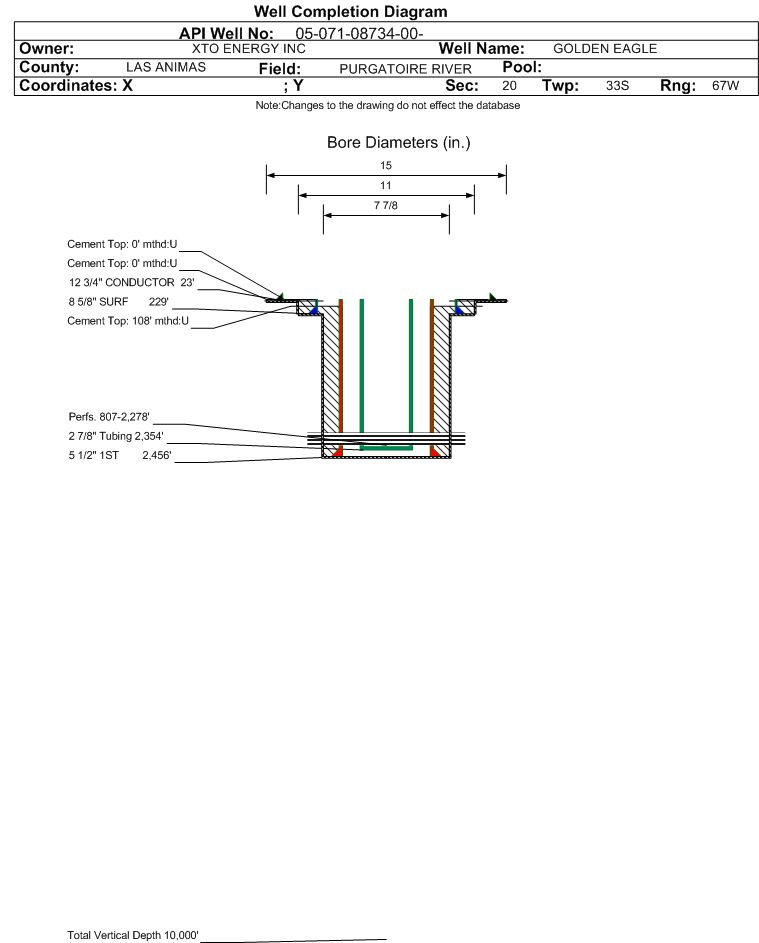 | Wellbore Completed | | Completion Date: | 3/18/2006 | | Spud Date: | 3/13/2006 | Spud Date Is: | ACTUAL | | Measured TD: | 2545 ft. | Measured PB depth: | 2409 ft. | | True Vertical TD: | | True Vertical PB depth: | | | Log Types: | GR/CBL/CCL | | Casing: | String Type: CONDUCTOR, Hole Size: 15 in., Size: 12.75 in., Top: , Depth: 23 ft., Weight: , Citings Type: ACTUAL | | Cement: | Sacks: 9, Top: 0 ft., Bottom: 23 ft., Determination Method: CALC | | Casing: | String Type: SURF, Hole Size: 11 in., Size: 8.625 in., Top: , Depth: 229 ft., Weight: , Citings Type: ACTUAL | | Cement: | Sacks: 225, Top: 0 ft., Bottom: 229 ft., Determination Method: CALC | | Casing: | String Type: 1ST, Hole Size: 7.875 in., Size: 5.5 in., Top: , Depth: 2456 ft., Weight: , Citings Type: ACTUAL | | Cement: | Sacks: 475, Top: 108 ft., Bottom: 2456 ft., Determination Method: CBL | | Formation | Interval Top | Log Bottom | Cored | DSTs | | RATON COAL | 0 ft. | 1718 ft. | N | N | | VERMEJO COAL | 1856 ft. | 2290 ft. | N | N | | TRINIDAD | 2290 ft. | | N | N |