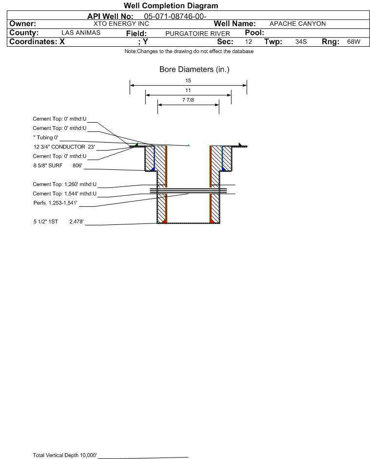 | Wellbore Completed | | Completion Date: | 8/6/2006 | | Spud Date: | 8/3/2006 | Spud Date Is: | ACTUAL | | Measured TD: | 2500 ft. | Measured PB depth: | 2429 ft. | | True Vertical TD: | | True Vertical PB depth: | | | Log Types: | DUAL INDUCTION; COMP DENSITY/NEUTRON W/CALIPER; CBL | | Casing: | String Type: CONDUCTOR, Hole Size: 15 in., Size: 12.75 in., Top: 0 ft., Depth: 23 ft., Weight: , Citings Type: ACTUAL | | Cement: | Sacks: 8, Top: , Bottom: 23 ft., Determination Method: CALC | | Casing: | String Type: SURF, Hole Size: 11 in., Size: 8.625 in., Top: 0 ft., Depth: 806 ft., Weight: 24 , Citings Type: ACTUAL | | Cement: | Sacks: 528, Top: 0 ft., Bottom: 806 ft., Determination Method: CALC | | Casing: | String Type: 1ST, Hole Size: 7.875 in., Size: 5.5 in., Top: 0 ft., Depth: 2478 ft., Weight: 15.5 , Citings Type: ACTUAL | | Cement: | Sacks: 371, Top: 1544 ft., Bottom: 2478 ft., Determination Method: CBL | | Casing: | String Type: S.C. 1.1, Hole Size: , Size: , Top: , Depth: 1541 ft., Weight: , Citings Type: ACTUAL | | Cement: | Sacks: 200, Top: 1260 ft., Bottom: 1541 ft., Determination Method: CALC | | Casing: | String Type: S.C. 1.2, Hole Size: , Size: , Top: , Depth: 1254 ft., Weight: , Citings Type: ACTUAL | | Cement: | Sacks: 175, Top: 0 ft., Bottom: 1254 ft., Determination Method: CALC | | Formation | Interval Top | Log Bottom | Cored | DSTs | | RATON SAND | 0 ft. | 1800 ft. | N | N | | VERMEJO COAL | 1888 ft. | 2245 ft. | N | N | | TRINIDAD | 2245 ft. | 2496 ft. | N | N |