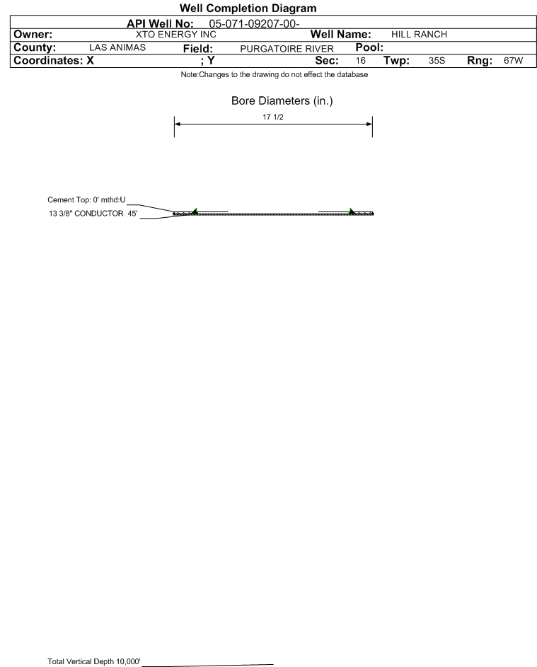 | Wellbore Completed | | Completion Date: | 4/9/2007 | | Spud Date: | 4/7/2007 | Spud Date Is: | ACTUAL | | Measured TD: | 52 ft. | Measured PB depth: | | | True Vertical TD: | | True Vertical PB depth: | | | Log Types: | | | Casing: | String Type: CONDUCTOR, Hole Size: 17.5 in., Size: 13.375 in., Top: 0 ft., Depth: 45 ft., Weight: , Citings Type: ACTUAL | | Cement: | Sacks: , Top: 0 ft., Bottom: 45 ft., Determination Method: CALC | | No formation data to display. |