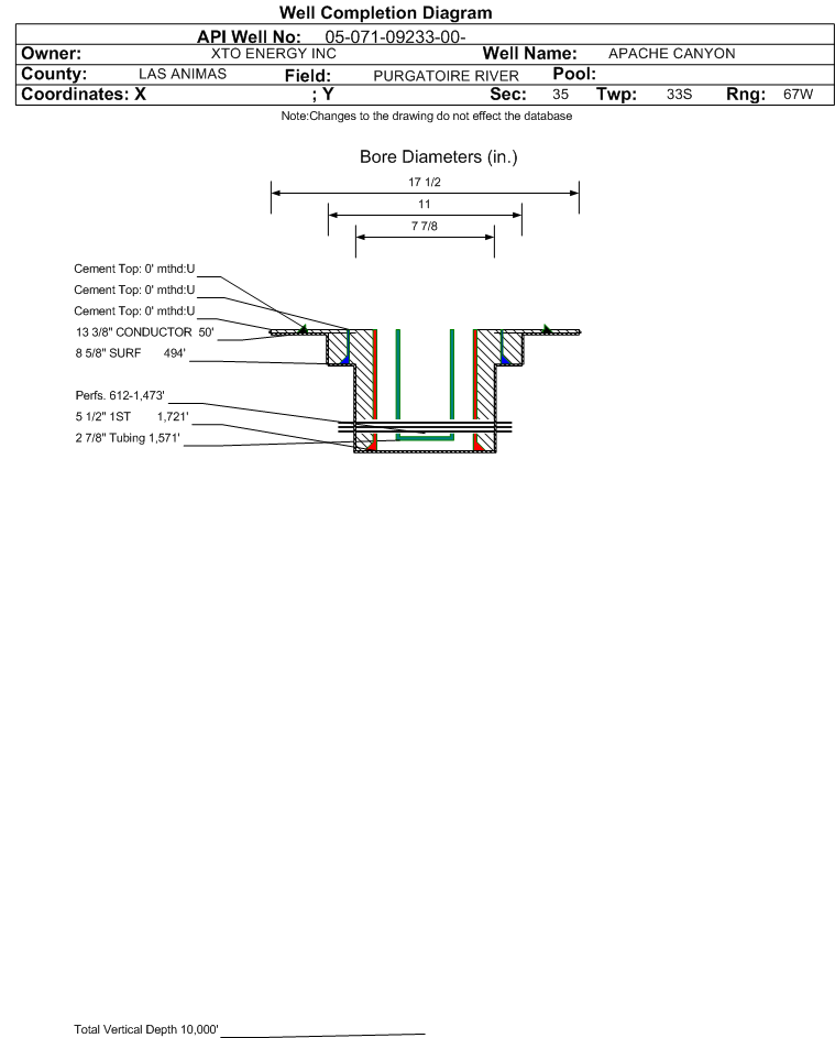 | | Perforation Data: | | Interval Top: | 612 ft. | # Of Holes: | 88 | | Interval Bottom: | 1473 ft. | Hole Size: | 0.45 in. |