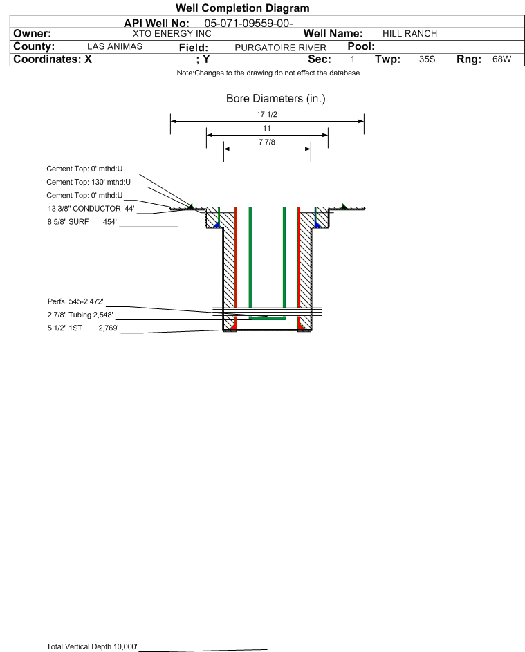 | Wellbore Completed | | Completion Date: | 2/5/2010 | | Spud Date: | 2/2/2010 | Spud Date Is: | ACTUAL | | Measured TD: | 2818 ft. | Measured PB depth: | 2723 ft. | | True Vertical TD: | | True Vertical PB depth: | | | Log Types: | DUAL INDUCTION, COMPENSATED DENSITY/NEUTRON, CBL | | Casing: | String Type: CONDUCTOR, Hole Size: 17.5 in., Size: 13.375 in., Top: 0 ft., Depth: 44 ft., Weight: , Citings Type: ACTUAL | | Cement: | Sacks: 84, Top: 0 ft., Bottom: 50 ft., Determination Method: | | Casing: | String Type: SURF, Hole Size: 11 in., Size: 8.625 in., Top: 0 ft., Depth: 454 ft., Weight: , Citings Type: ACTUAL | | Cement: | Sacks: 216, Top: 0 ft., Bottom: 460 ft., Determination Method: | | Casing: | String Type: 1ST, Hole Size: 7.875 in., Size: 5.5 in., Top: 0 ft., Depth: 2769 ft., Weight: , Citings Type: ACTUAL | | Cement: | Sacks: 430, Top: 130 ft., Bottom: 2818 ft., Determination Method: CBL | | Formation | Interval Top | Log Bottom | Cored | DSTs | | RATON COAL | 0 ft. | | N | N | | VERMEJO COAL | 2111 ft. | | N | N | | TRINIDAD | 2516 ft. | | N | N |