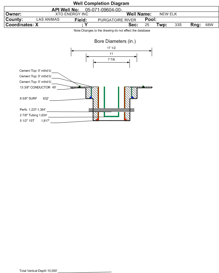 | | Perforation Data: | | Interval Top: | 1237 ft. | # Of Holes: | 42 | | Interval Bottom: | 1364 ft. | Hole Size: | 0.45 in. |