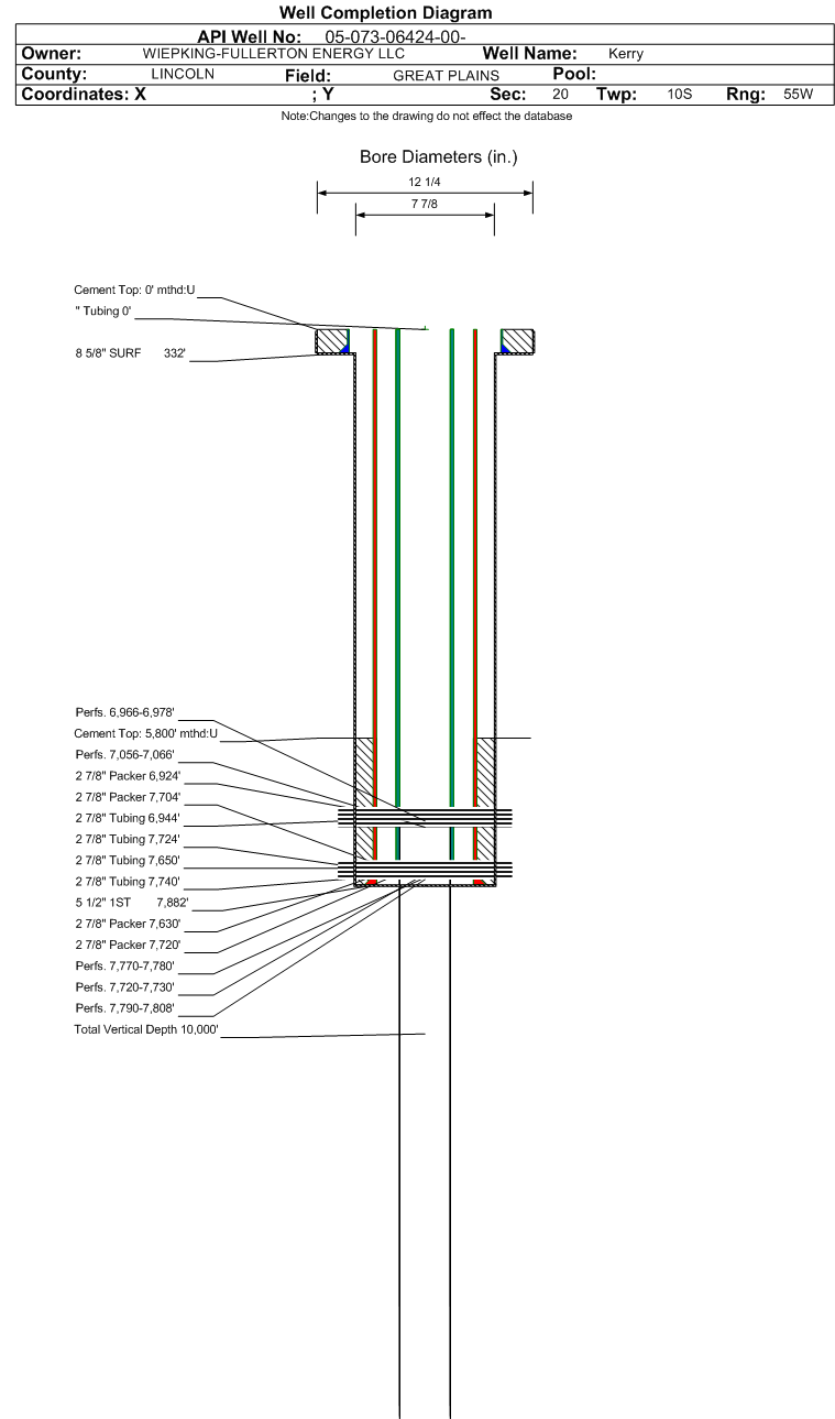 | | Tubing Size: | 2.875 in. | Tubing Setting Depth: | 7740 ft. | | Tubing Packer Depth: | 7740 ft. | Tubing Multiple Packer: | | | Open Hole Top: | | Open Hole Bottom: | | | Initial Test Data: | | Test Date: | 12/16/2010 | Test Method: | SWAB | | Hours Tested: | 8 | Gas Type: | | | Gas Disposal: | | |