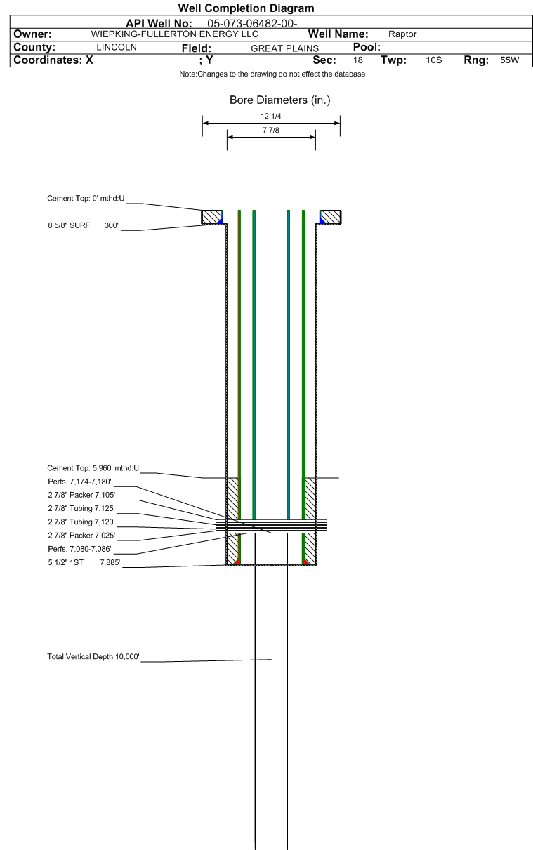 | | Tubing Size: | 2.875 in. | Tubing Setting Depth: | 7120 ft. | | Tubing Packer Depth: | 7045 ft. | Tubing Multiple Packer: | | | Open Hole Top: | | Open Hole Bottom: | | | Initial Test Data: | | Test Date: | 10/26/2012 | Test Method: | SWAB | | Hours Tested: | 8 | Gas Type: | | | Gas Disposal: | | |