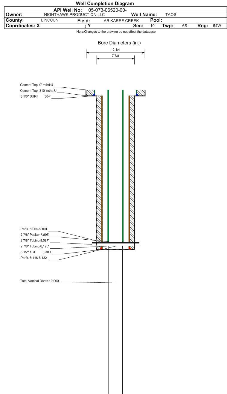 Wellbore #00 Wellbore Classification: OW Status: PR - 8/1/2016 Measured TD: 8318 ft.| Wellbore Data for Original Wellbore | Wellbore Classification: OW PR - 8/1/2016 | | Wellbore Permit | DIRECTIONAL | | Permit #: | | Expiration Date: | 2/27/2015 | | Proposed Top PZ Location: | Sec:10 Twp: 6S 54W | Footage: 1186 FNL 649 FEL | | Bottom Hole Location: | Sec:10 Twp: 6S 54W | Footage: 1186 FNL 649 FEL | | Proposed Depth/Form: | 8600 ft. | | Surface Mineral Owner Same: | Yes | | Mineral Owner: | FEE | Surface Owner: | FEE | | Unit: | | Unit Number: | | | Formation And Spacing: | Code: ABCK , Formation: ARBUCKLE , Order: , Unit Acreage: , Drill Unit: | | Formation And Spacing: | Code: ATOK , Formation: ATOKA , Order: , Unit Acreage: , Drill Unit: | | Formation And Spacing: | Code: CHRK , Formation: CHEROKEE , Order: , Unit Acreage: , Drill Unit: | | Formation And Spacing: | Code: LGKC , Formation: LANSING-KANSAS CITY , Order: , Unit Acreage: , Drill Unit: | | Formation And Spacing: | Code: MRRW , Formation: MORROW , Order: , Unit Acreage: , Drill Unit: | | Formation And Spacing: | Code: MSSP , Formation: MISSISSIPPIAN , Order: , Unit Acreage: , Drill Unit: | | Formation And Spacing: | Code: SPGN , Formation: SPERGEN , Order: , Unit Acreage: , Drill Unit: | | Formation And Spacing: | Code: WFCMP , Formation: WOLFCAMP , Order: , Unit Acreage: , Drill Unit: | | Formation And Spacing: | Code: WRSW , Formation: WARSAW , Order: , Unit Acreage: , Drill Unit: | | Casing: | String Type: SURF, Hole Size: 12.25 in., Size: 8.625 in., Top: 0 ft., Depth: 300 ft., Weight: 24 , Citings Type: PLANNED | | Cement: | Sacks: 197, Top: 0 ft., Bottom: 300 ft. | | Casing: | String Type: 1ST, Hole Size: 7.875 in., Size: 5.5 in., Top: 0 ft., Depth: 8600 ft., Weight: 17 , Citings Type: PLANNED | | Cement: | Sacks: 584, Top: 3619 ft., Bottom: 8600 ft. |
