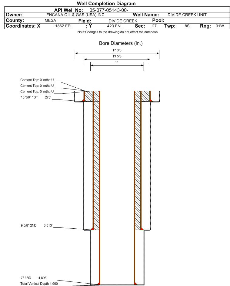 | Wellbore Completed | | Completion Date: | 4/16/1960 | | Measured TD: | 4900 ft. | Measured PB depth: | 4500 ft. | | True Vertical TD: | 4900 ft. | True Vertical PB depth: | | | Casing: | String Type: 1ST, Hole Size: , Size: 13.375 in., Top: 0 ft., Depth: 273 ft., Weight: , Citings Type: HISTORICAL | | Cement: | Sacks: 0, Top: 0 ft., Bottom: , Determination Method: | | Casing: | String Type: 2ND, Hole Size: , Size: 9.625 in., Top: 0 ft., Depth: 3513 ft., Weight: , Citings Type: HISTORICAL | | Cement: | Sacks: 0, Top: 0 ft., Bottom: , Determination Method: | | Casing: | String Type: 3RD, Hole Size: , Size: 7 in., Top: 0 ft., Depth: 4896 ft., Weight: , Citings Type: HISTORICAL | | Cement: | Sacks: 0, Top: 0 ft., Bottom: , Determination Method: | | Formation | Interval Top | Log Bottom | Cored | DSTs | | MESAVERDE | 0 ft. | | | |