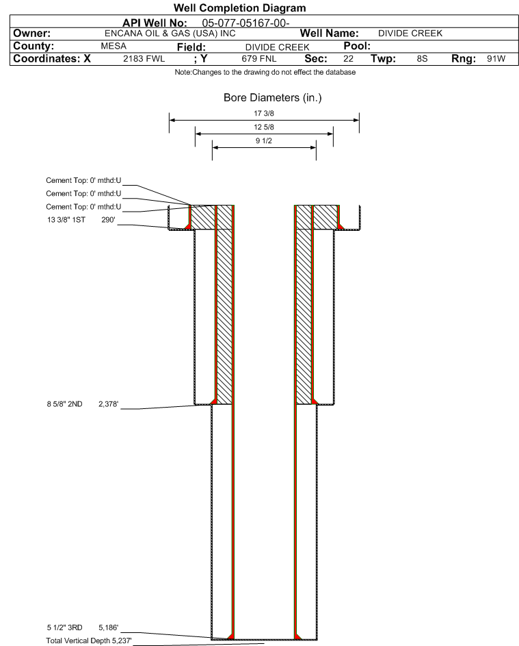 | Wellbore Completed | | Completion Date: | 10/14/1959 | | Measured TD: | 5237 ft. | Measured PB depth: | 5210 ft. | | True Vertical TD: | 5237 ft. | True Vertical PB depth: | | | Casing: | String Type: SURF, Hole Size: , Size: 13.375 in., Top: 0 ft., Depth: 290 ft., Weight: 48 , Citings Type: ACTUAL | | Cement: | Sacks: 275, Top: 0 ft., Bottom: , Determination Method: | | Casing: | String Type: 1ST, Hole Size: , Size: 8.625 in., Top: 0 ft., Depth: 2378 ft., Weight: 24 , Citings Type: ACTUAL | | Cement: | Sacks: 400, Top: 1420 ft., Bottom: , Determination Method: TEMP | | Casing: | String Type: 2ND, Hole Size: , Size: 5.5 in., Top: 0 ft., Depth: 5186 ft., Weight: 14 , Citings Type: ACTUAL | | Cement: | Sacks: 300, Top: 4134 ft., Bottom: , Determination Method: CALC | | Formation | Interval Top | Log Bottom | Cored | DSTs | | MESAVERDE | 0 ft. | | | |