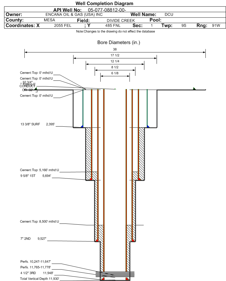 | Wellbore Completed | | Completion Date: | 5/3/2007 | | Spud Date: | 12/24/2006 | Spud Date Is: | ACTUAL | | Measured TD: | 11950 ft. | Measured PB depth: | | | True Vertical TD: | 11930 ft. | True Vertical PB depth: | | | Top PZ Location: | Sec:1 Twp: 9S 91W | Footage: 498 FNL 2407 FEL | | Bottom Hole Location: | Sec:1 Twp: 9S 91W | Footage: 498 FNL 2407 FEL | | Log Types: | CBL; PEX/FMI/SS/ XPT; (2)PEX-AI/LD/CN; MUD LOG | | Casing: | String Type: CONDUCTOR, Hole Size: , Size: , Top: 0 ft., Depth: 32 ft., Weight: 78.6 , Citings Type: ACTUAL | | Cement: | Sacks: , Top: 0 ft., Bottom: 32 ft., Determination Method: VISU | | Casing: | String Type: SURF, Hole Size: 17.5 in., Size: 13.375 in., Top: 0 ft., Depth: 2395 ft., Weight: 54.5 , Citings Type: ACTUAL | | Cement: | Sacks: 1455, Top: 0 ft., Bottom: 2395 ft., Determination Method: VISU | | Casing: | String Type: 1ST, Hole Size: 12.25 in., Size: 9.625 in., Top: 0 ft., Depth: 5694 ft., Weight: 47 , Citings Type: ACTUAL | | Cement: | Sacks: 710, Top: 0 ft., Bottom: 5694 ft., Determination Method: VISU | | Casing: | String Type: 2ND, Hole Size: 6.125 in., Size: 4.5 in., Top: 0 ft., Depth: 11948 ft., Weight: 11.6 , Citings Type: ACTUAL | | Cement: | Sacks: 200, Top: 8500 ft., Bottom: 11948 ft., Determination Method: CALC | | Casing: | String Type: 3RD, Hole Size: 6.125 in., Size: 4.5 in., Top: 0 ft., Depth: 11948 ft., Weight: , Citings Type: ACTUAL | | Cement: | Sacks: 200, Top: 8500 ft., Bottom: 11950 ft., Determination Method: CALC | | Casing: | String Type: 1ST LINER, Hole Size: 8.5 in., Size: , Top: 5166 ft., Depth: 9545 ft., Weight: 26 , Citings Type: ACTUAL | | Cement: | Sacks: 450, Top: 5166 ft., Bottom: 9545 ft., Determination Method: CALC | | Formation | Interval Top | Log Bottom | Cored | DSTs | | WILLIAMS FORK | 0 ft. | 4130 ft. | N | N | | ROLLINS | 4131 ft. | 4528 ft. | N | N | | COZZETTE | 4529 ft. | 4792 ft. | N | N | | CORCORAN | 4793 ft. | 5908 ft. | N | N | | MANCOS A | 5909 ft. | 7181 ft. | N | N | | MANCOS B | 7182 ft. | 10190 ft. | N | N | | NIOBRARA | 10191 ft. | 11751 ft. | N | N | | DAKOTA | 11752 ft. | 11950 ft. | N | N |