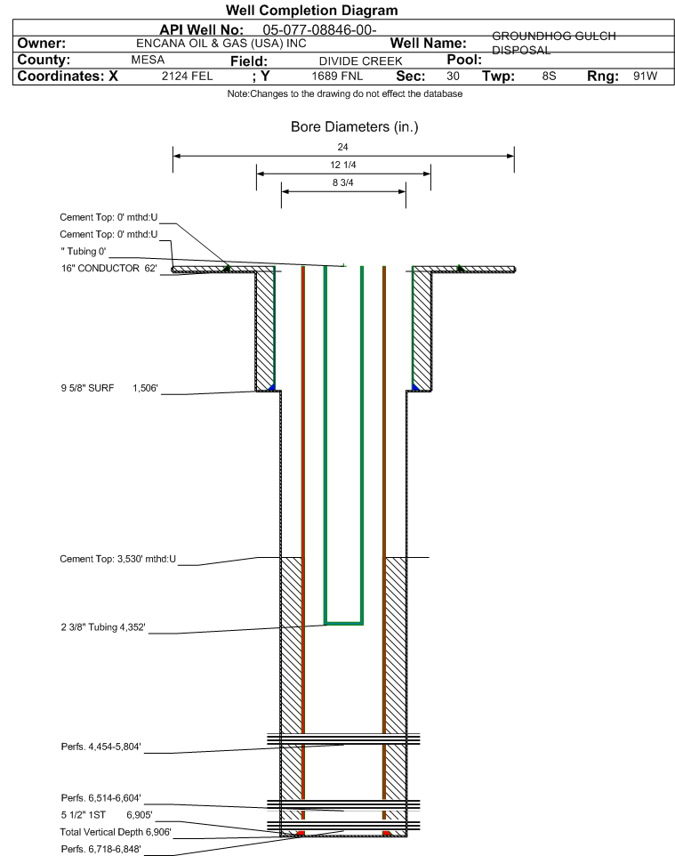 | Wellbore Completed | | Completion Date: | 8/8/2005 | | Spud Date: | 7/1/2005 | Spud Date Is: | ACTUAL | | Measured TD: | 6910 ft. | Measured PB depth: | 4640 ft. | | True Vertical TD: | 6906 ft. | True Vertical PB depth: | 4636 ft. | | Top PZ Location: | Sec:30 Twp: 8S 91W | Footage: 1580 FNL 1973 FEL | | Bottom Hole Location: | Sec:30 Twp: 8S 91W | Footage: 1580 FNL 1973 FEL | | Log Types: | CBL, PEX | | Log Types: | CBL | | Casing: | String Type: CONDUCTOR, Hole Size: , Size: , Top: 0 ft., Depth: 60 ft., Weight: 40# , Citings Type: ACTUAL | | Cement: | Sacks: 30, Top: 0 ft., Bottom: 60 ft., Determination Method: CALC | | Casing: | String Type: SURF, Hole Size: 12.25 in., Size: 8.625 in., Top: 0 ft., Depth: 1525 ft., Weight: 32# , Citings Type: ACTUAL | | Cement: | Sacks: 1075, Top: 0 ft., Bottom: 1525 ft., Determination Method: CALC | | Casing: | String Type: 1ST, Hole Size: 7.875 in., Size: 5.5 in., Top: 0 ft., Depth: 6149 ft., Weight: 17# , Citings Type: ACTUAL | | Cement: | Sacks: 781, Top: 1500 ft., Bottom: 6149 ft., Determination Method: CBL | | Additional Cement: | String Type: 1ST , Top: 3881 ft., Depth: 3880 ft., Bottom: 3880 ft., Sacks: 100, Method: SQUEEZE | | Additional Cement: | String Type: 1ST , Top: 2855 ft., Depth: 2854 ft., Bottom: 2854 ft., Sacks: 50, Method: SQUEEZE | | Additional Cement: | String Type: 1ST , Top: 2231 ft., Depth: 2330 ft., Bottom: 2330 ft., Sacks: 100, Method: SQUEEZE | | Formation | Interval Top | Log Bottom | Cored | DSTs | | WASATCH | 0 ft. | 2979 ft. | | | | WILLIAMS FORK | 2980 ft. | 5909 ft. | | | | ROLLINS | 5910 ft. | 6496 ft. | | | | COZZETTE | 6497 ft. | 6667 ft. | | | | CORCORAN | 6668 ft. | 6910 ft. | | |