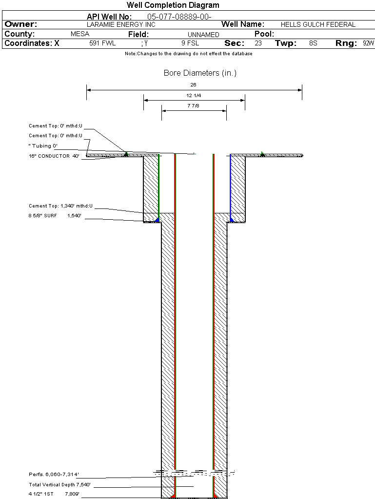 | Wellbore Completed | | Completion Date: | 8/27/2006 | | Spud Date: | 8/8/2006 | Spud Date Is: | ACTUAL | | Measured TD: | 7825 ft. | Measured PB depth: | 7780 ft. | | True Vertical TD: | 7540 ft. | True Vertical PB depth: | 7495 ft. | | Top PZ Location: | Sec:23 Twp: 8S 92W | Footage: 683 FSL 2006 FWL | | Bottom Hole Location: | Sec:23 Twp: 8S 92W | Footage: 683 FSL 2006 FWL | | Log Types: | HRI/SP/GR/CAL; SPECTRAL DENSITY/DUAL SPACED NEUTRON; CBL/TEMP/GR/CCL | | Casing: | String Type: CONDUCTOR, Hole Size: 26 in., Size: 16 in., Top: 0 ft., Depth: 40 ft., Weight: , Citings Type: ACTUAL | | Cement: | Sacks: , Top: 0 ft., Bottom: 40 ft., Determination Method: CALC | | Casing: | String Type: SURF, Hole Size: 12.25 in., Size: 8.625 in., Top: 0 ft., Depth: 1540 ft., Weight: , Citings Type: ACTUAL | | Cement: | Sacks: 420, Top: 0 ft., Bottom: 1540 ft., Determination Method: CALC | | Casing: | String Type: 1ST, Hole Size: 7.875 in., Size: 4.5 in., Top: 0 ft., Depth: 7809 ft., Weight: , Citings Type: ACTUAL | | Cement: | Sacks: 1265, Top: 1340 ft., Bottom: 7809 ft., Determination Method: CBL | | Formation | Interval Top | Log Bottom | Cored | DSTs | | WILLIAMS FORK | 4290 ft. | | N | N | | CAMEO | 6887 ft. | | N | N | | ROLLINS | 7628 ft. | | N | N |