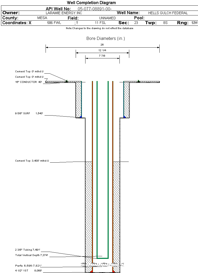 | Wellbore Completed | | Completion Date: | 8/6/2006 | | Spud Date: | 7/20/2006 | Spud Date Is: | ACTUAL | | Measured TD: | 8073 ft. | Measured PB depth: | 8023 ft. | | True Vertical TD: | 7374 ft. | True Vertical PB depth: | 7324 ft. | | Top PZ Location: | Sec:23 Twp: 8 92W | Footage: 1973 FSL 1965 FWL | | Bottom Hole Location: | Sec:23 Twp: 8 92W | Footage: 1973 FSL 1965 FWL | | Log Types: | PLAT EXP-RES/GR/SP, SIDEWALL/GR, CBL/GR/CCL/TEMP | | Casing: | String Type: CONDUCTOR, Hole Size: 26 in., Size: 16 in., Top: 0 ft., Depth: 40 ft., Weight: , Citings Type: ACTUAL | | Cement: | Sacks: , Top: 0 ft., Bottom: 40 ft., Determination Method: CALC | | Casing: | String Type: SURF, Hole Size: 12.25 in., Size: 9.625 in., Top: 0 ft., Depth: 1540 ft., Weight: , Citings Type: ACTUAL | | Cement: | Sacks: 420, Top: 0 ft., Bottom: 1540 ft., Determination Method: CALC | | Casing: | String Type: 1ST, Hole Size: 7.875 in., Size: 4.5 in., Top: 0 ft., Depth: 8068 ft., Weight: , Citings Type: ACTUAL | | Cement: | Sacks: 1680, Top: 3400 ft., Bottom: 8068 ft., Determination Method: CBL | | Formation | Interval Top | Log Bottom | Cored | DSTs | | WILLIAMS FORK | 4678 ft. | | N | N | | CAMEO | 7320 ft. | | N | N | | ROLLINS | 7996 ft. | | N | N |