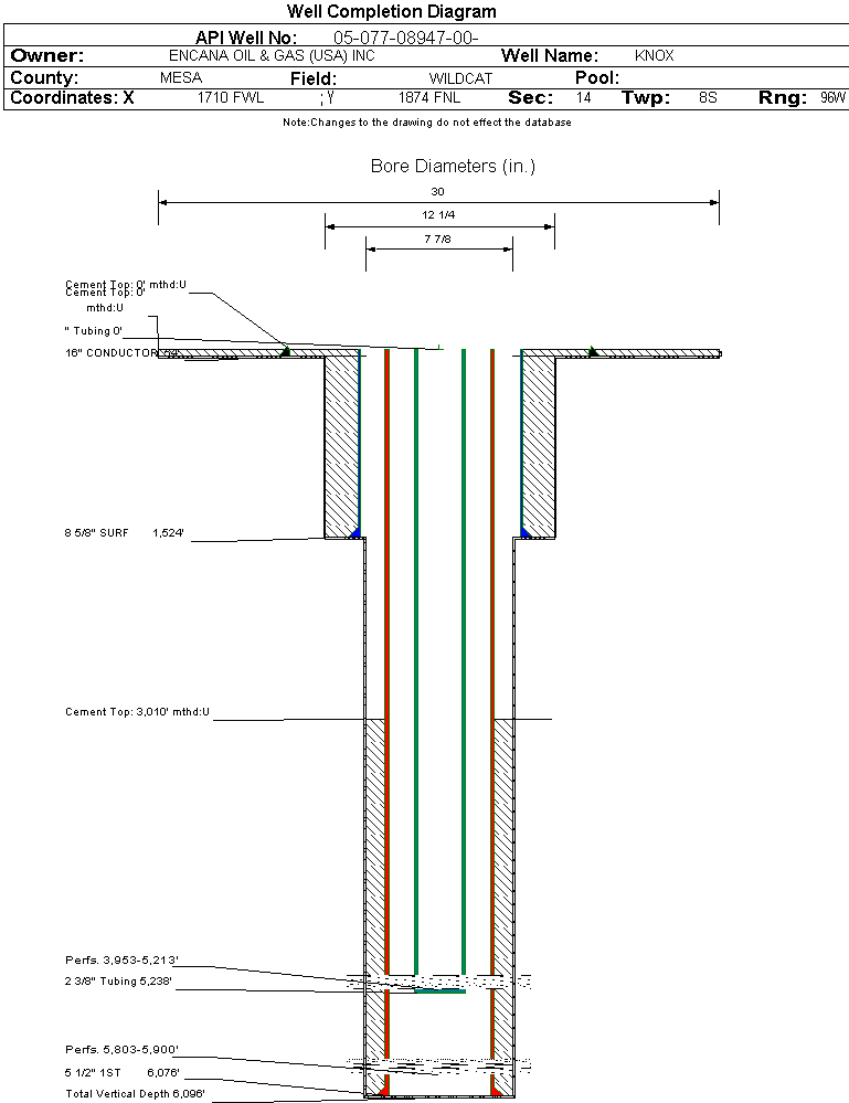 | Wellbore Completed | | Completion Date: | 12/17/2005 | | Spud Date: | 11/21/2005 | Spud Date Is: | ACTUAL | | Measured TD: | 6099 ft. | Measured PB depth: | 6038 ft. | | True Vertical TD: | 6096 ft. | True Vertical PB depth: | | | Bottom Hole Location: | Sec: Twp: | Footage: FL FL | | Log Types: | PLEX-AI/GR (2), CBL/GR/CCL/TEMP | | Casing: | String Type: CONDUCTOR, Hole Size: 30 in., Size: 16 in., Top: 0 ft., Depth: 54 ft., Weight: , Citings Type: ACTUAL | | Cement: | Sacks: 125, Top: 0 ft., Bottom: 54 ft., Determination Method: CALC | | Casing: | String Type: SURF, Hole Size: 12.25 in., Size: 8.625 in., Top: 0 ft., Depth: 1524 ft., Weight: , Citings Type: ACTUAL | | Cement: | Sacks: 1060, Top: 0 ft., Bottom: 1524 ft., Determination Method: CALC | | Casing: | String Type: 1ST, Hole Size: 7.875 in., Size: 5.5 in., Top: 0 ft., Depth: 6076 ft., Weight: , Citings Type: ACTUAL | | Cement: | Sacks: 970, Top: 3010 ft., Bottom: 6076 ft., Determination Method: CBL | | Formation | Interval Top | Log Bottom | Cored | DSTs | | WASATCH | 0 ft. | 2916 ft. | N | N | | WILLIAMS FORK | 2917 ft. | 5288 ft. | N | N | | ROLLINS | 5289 ft. | 5556 ft. | N | N | | COZZETTE | 5557 ft. | 5793 ft. | N | N | | CORCORAN | 5794 ft. | 6099 ft. | N | N |