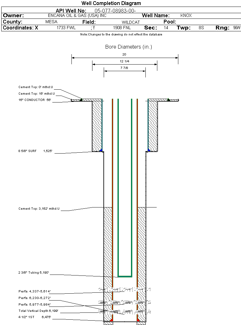 | Wellbore Completed | | Completion Date: | 4/17/2006 | | Spud Date: | 4/2/2006 | Spud Date Is: | ACTUAL | | Measured TD: | 6490 ft. | Measured PB depth: | 6390 ft. | | True Vertical TD: | 6199 ft. | True Vertical PB depth: | | | Top PZ Location: | Sec:14 Twp: 8S 96W | Footage: 1911 FNL 2026 FEL | | Bottom Hole Location: | Sec:14 Twp: 8S 96W | Footage: 1911 FNL 2026 FEL | | Log Types: | PEX,CBL | | Casing: | String Type: CONDUCTOR, Hole Size: 20 in., Size: 16 in., Top: 0 ft., Depth: 56 ft., Weight: , Citings Type: ACTUAL | | Cement: | Sacks: 100, Top: 16 ft., Bottom: 56 ft., Determination Method: CALC | | Casing: | String Type: SURF, Hole Size: 12.25 in., Size: 8.625 in., Top: 0 ft., Depth: 1525 ft., Weight: , Citings Type: ACTUAL | | Cement: | Sacks: 960, Top: 0 ft., Bottom: 1560 ft., Determination Method: CALC | | Casing: | String Type: 1ST, Hole Size: 7.875 in., Size: 4.5 in., Top: 0 ft., Depth: 6475 ft., Weight: , Citings Type: ACTUAL | | Cement: | Sacks: 980, Top: 3162 ft., Bottom: 6577 ft., Determination Method: CBL | | Formation | Interval Top | Log Bottom | Cored | DSTs | | WASATCH | 0 ft. | 3019 ft. | N | N | | MESAVERDE | 3020 ft. | 3433 ft. | N | N | | WILLIAMS FORK | 3434 ft. | 5692 ft. | N | N | | ROLLINS | 5693 ft. | 5976 ft. | N | N | | COZZETTE | 5977 ft. | 6226 ft. | N | N | | CORCORAN | 6227 ft. | 6490 ft. | N | N |