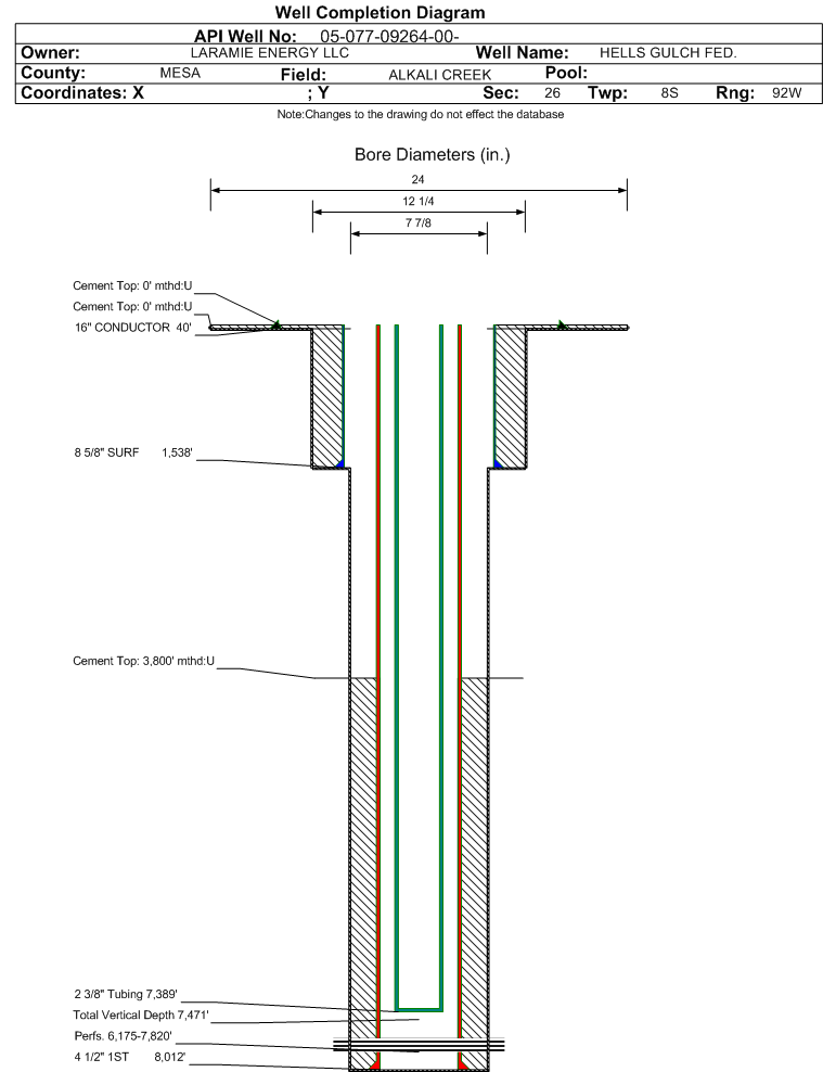 | | Tubing Size: | 2.375 in. | Tubing Setting Depth: | 7389 ft. | | Tubing Packer Depth: | | Tubing Multiple Packer: | | | Open Hole Top: | | Open Hole Bottom: | | | Initial Test Data: | | Test Date: | N/A | Test Method: | | | Hours Tested: | | Gas Type: | | | Gas Disposal: | | |