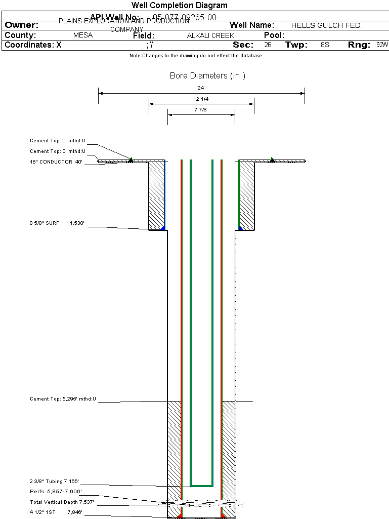 | Wellbore Completed | | Completion Date: | 7/8/2007 | | Spud Date: | 6/22/2007 | Spud Date Is: | ACTUAL | | Measured TD: | 7848 ft. | Measured PB depth: | | | True Vertical TD: | 7537 ft. | True Vertical PB depth: | | | Top PZ Location: | Sec:23 Twp: 8S 92W | Footage: 1012 FSL 1976 FWL | | Bottom Hole Location: | Sec:23 Twp: 8S 92W | Footage: 1012 FSL 1976 FWL | | Log Types: | HRI/SP/GR/CAL, SD/DSN, CBL, MUD | | Casing: | String Type: CONDUCTOR, Hole Size: 24 in., Size: 16 in., Top: 0 ft., Depth: 40 ft., Weight: , Citings Type: ACTUAL | | Cement: | Sacks: 0, Top: 0 ft., Bottom: 40 ft., Determination Method: CALC | | Casing: | String Type: SURF, Hole Size: 12.25 in., Size: 8.625 in., Top: 0 ft., Depth: 1530 ft., Weight: , Citings Type: ACTUAL | | Cement: | Sacks: 460, Top: 0 ft., Bottom: 1530 ft., Determination Method: | | Casing: | String Type: 1ST, Hole Size: 7.875 in., Size: 4.5 in., Top: 0 ft., Depth: 7846 ft., Weight: , Citings Type: ACTUAL | | Cement: | Sacks: 1150, Top: 5295 ft., Bottom: 7848 ft., Determination Method: CBL | | Formation | Interval Top | Log Bottom | Cored | DSTs | | WILLIAMS FORK | 5853 ft. | 6918 ft. | N | N | | CAMEO | 6918 ft. | 7652 ft. | N | N | | ROLLINS | 7652 ft. | | N | N |