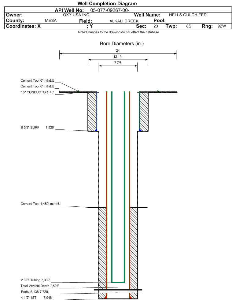 | Wellbore Completed | | Completion Date: | 6/23/2008 | | Spud Date: | 6/8/2008 | Spud Date Is: | ACTUAL | | Measured TD: | 7940 ft. | Measured PB depth: | 7883 ft. | | True Vertical TD: | 7507 ft. | True Vertical PB depth: | 7450 ft. | | Top PZ Location: | Sec:23 Twp: 8S 92W | Footage: 1482 FSL 1953 FWL | | Bottom Hole Location: | Sec:23 Twp: 8S 92W | Footage: 1482 FSL 1953 FWL | | Log Types: | HRI/SD/DSN; MUD, CBL | | Casing: | String Type: CONDUCTOR, Hole Size: 24 in., Size: 16 in., Top: 0 ft., Depth: 40 ft., Weight: , Citings Type: ACTUAL | | Cement: | Sacks: , Top: 0 ft., Bottom: 40 ft., Determination Method: CALC | | Casing: | String Type: SURF, Hole Size: 12.25 in., Size: 8.625 in., Top: 0 ft., Depth: 1526 ft., Weight: 32 , Citings Type: ACTUAL | | Cement: | Sacks: 420, Top: 0 ft., Bottom: 1526 ft., Determination Method: CALC | | Casing: | String Type: 1ST, Hole Size: 7.875 in., Size: 4.5 in., Top: 0 ft., Depth: 7948 ft., Weight: 11.6 , Citings Type: ACTUAL | | Cement: | Sacks: 1270, Top: 4450 ft., Bottom: 7948 ft., Determination Method: CBL | | Formation | Interval Top | Log Bottom | Cored | DSTs | | WILLIAMS FORK | 6123 ft. | 7047 ft. | N | N | | CAMEO | 7047 ft. | 7764 ft. | N | N | | ROLLINS | 7764 ft. | | N | N |
