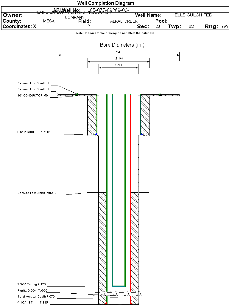 | Wellbore Completed | | Completion Date: | 8/19/2007 | | Spud Date: | 8/4/2007 | Spud Date Is: | ACTUAL | | Measured TD: | 7852 ft. | Measured PB depth: | | | True Vertical TD: | 7576 ft. | True Vertical PB depth: | | | Top PZ Location: | Sec:23 Twp: 8S 92W | Footage: 1667 FSL 636 FWL | | Bottom Hole Location: | Sec:23 Twp: 8S 92W | Footage: 1667 FSL 636 FWL | | Log Types: | HRI/SP/GR/CAL, SD/DSN, CBL, MUD | | Casing: | String Type: CONDUCTOR, Hole Size: 24 in., Size: 16 in., Top: 0 ft., Depth: 40 ft., Weight: , Citings Type: ACTUAL | | Cement: | Sacks: , Top: 0 ft., Bottom: 40 ft., Determination Method: CALC | | Casing: | String Type: SURF, Hole Size: 12.25 in., Size: 8.625 in., Top: 0 ft., Depth: 1520 ft., Weight: , Citings Type: ACTUAL | | Cement: | Sacks: 460, Top: 0 ft., Bottom: 1520 ft., Determination Method: | | Casing: | String Type: 1ST, Hole Size: 7.875 in., Size: 4.5 in., Top: 0 ft., Depth: 7835 ft., Weight: , Citings Type: ACTUAL | | Cement: | Sacks: 1140, Top: 3650 ft., Bottom: 7835 ft., Determination Method: CBL | | Formation | Interval Top | Log Bottom | Cored | DSTs | | WILLIAMS FORK | 6077 ft. | 6981 ft. | N | N | | CAMEO | 6981 ft. | 7697 ft. | N | N | | ROLLINS | 7697 ft. | | N | N |