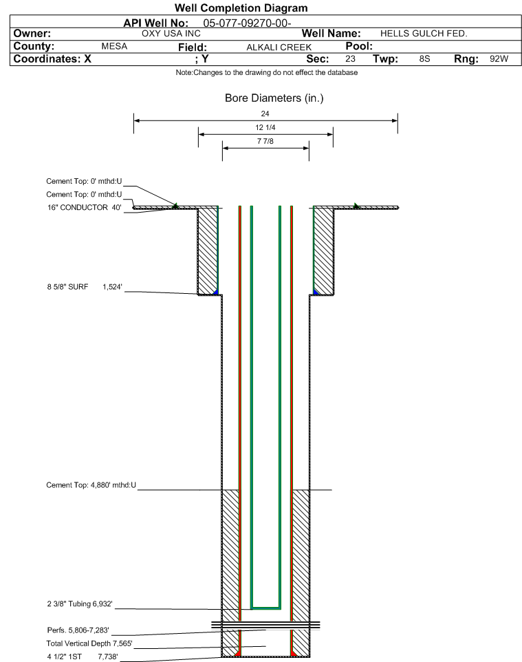 Wellbore #00 Wellbore Classification: GW Status: PR - 2/1/2015 Measured TD: 7740 ft. Vertical TD: 7565 ft.| Wellbore Data for Original Wellbore | Wellbore Classification: GW PR - 2/1/2015 | | Wellbore Permit | DIRECTIONAL | | Permit #: | 20071119 | Expiration Date: | 4/4/2008 | | Proposed Top PZ Location: | Sec:23 Twp: 8S 92W | Footage: 1328 FSL 632 FWL | | Bottom Hole Location: | Sec:23 Twp: 8S 92W | Footage: 1328 FSL 632 FWL | | Proposed Depth/Form: | 7733 ft. | | Surface Mineral Owner Same: | Yes | | Mineral Owner: | FEDERAL | Surface Owner: | FEDERAL | | Unit: | | Unit Number: | | | Formation And Spacing: | Code: MVRD , Formation: MESAVERDE , Order: 529-1 , Unit Acreage: , Drill Unit: |