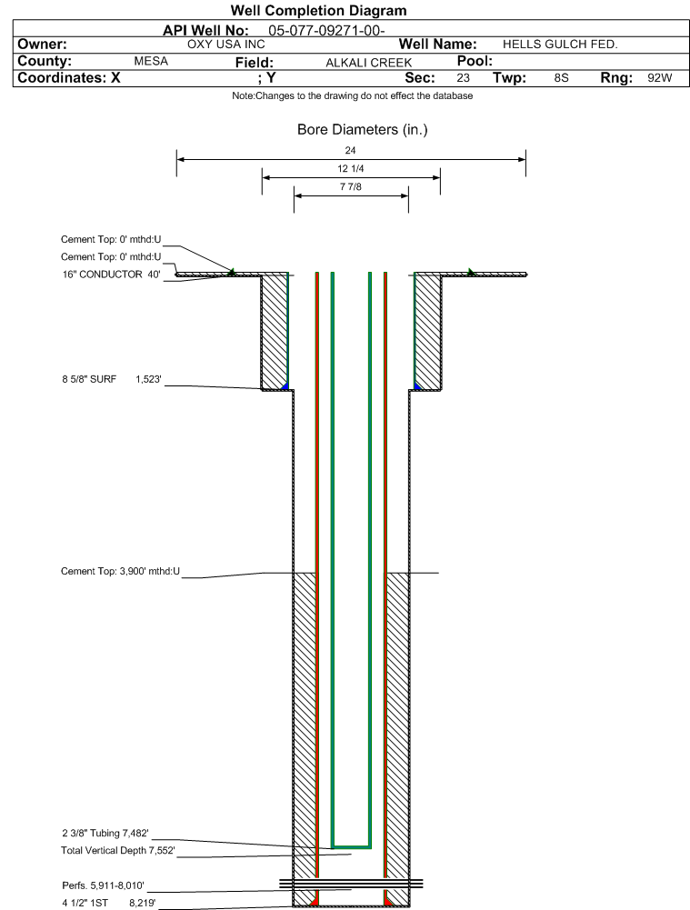 | Wellbore Completed | | Completion Date: | 6/19/2007 | | Spud Date: | 6/1/2007 | Spud Date Is: | ACTUAL | | Measured TD: | 8229 ft. | Measured PB depth: | | | True Vertical TD: | 7552 ft. | True Vertical PB depth: | | | Top PZ Location: | Sec:23 Twp: 8S 92W | Footage: 2313 FSL 1988 FWL | | Bottom Hole Location: | Sec:23 Twp: 8S 92W | Footage: 2313 FSL 1988 FWL | | Log Types: | CBL/TEMP/GR | | Log Types: | TRIPLE COMBO, CBL | | Casing: | String Type: CONDUCTOR, Hole Size: 24 in., Size: 16 in., Top: 0 ft., Depth: 40 ft., Weight: , Citings Type: ACTUAL | | Cement: | Sacks: , Top: 0 ft., Bottom: 40 ft., Determination Method: CALC | | Casing: | String Type: SURF, Hole Size: 12.25 in., Size: 8.625 in., Top: 0 ft., Depth: 1523 ft., Weight: 32 , Citings Type: ACTUAL | | Cement: | Sacks: 460, Top: 0 ft., Bottom: 1523 ft., Determination Method: | | Casing: | String Type: 1ST, Hole Size: 7.875 in., Size: 4.5 in., Top: , Depth: 8219 ft., Weight: , Citings Type: ACTUAL | | Cement: | Sacks: 1265, Top: 3900 ft., Bottom: 8219 ft., Determination Method: CBL | | Formation | Interval Top | Log Bottom | Cored | DSTs | | WILLIAMS FORK | 5900 ft. | 7330 ft. | N | N | | CAMEO | 7330 ft. | 8040 ft. | N | N | | ROLLINS | 8040 ft. | | N | N |