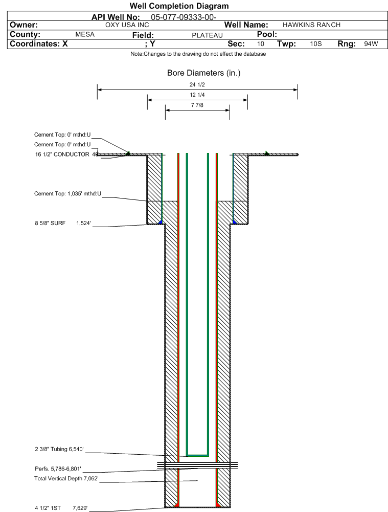 Wellbore #00 Wellbore Classification: GW Status: PA - 2/13/2013 Measured TD: 7629 ft. Vertical TD: 7062 ft.| Wellbore Data for Original Wellbore | Wellbore Classification: GW PA - 2/13/2013 | | Wellbore Permit | DIRECTIONAL | | Permit #: | 20072787 | Expiration Date: | 7/15/2008 | | Proposed Top PZ Location: | Sec: Twp: | Footage: 652 FNL 1984 FEL | | Bottom Hole Location: | Sec:10 Twp: 10S 94W | Footage: 652 FNL 1984 FEL | | Proposed Depth/Form: | 7595 ft. | | Surface Mineral Owner Same: | Yes | | Mineral Owner: | FEE | Surface Owner: | FEE | | Unit: | | Unit Number: | | | Formation And Spacing: | Code: MVRD , Formation: MESAVERDE , Order: , Unit Acreage: , Drill Unit: |
